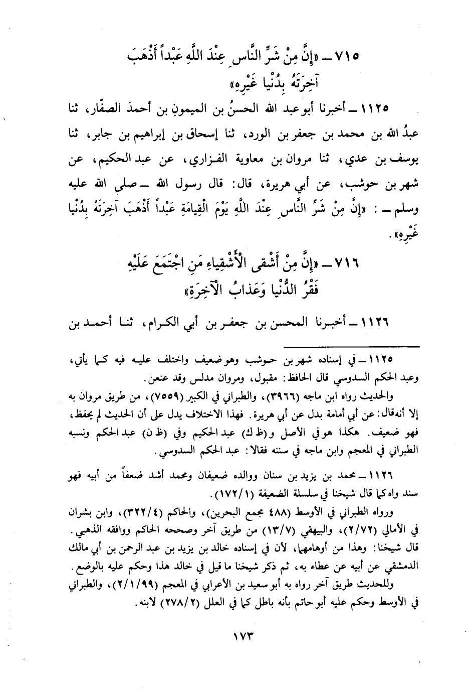 1125 - أَخْبَرَنَا أَبُو عَبْدِ اللَّهِ الْحَسَنُ بْنُ الْمَيْمُونِ بْنِ أَحْمَدَ الصَّفَّارُ، ثنا عَبْدُ اللَّهِ بْنُ مُحَمَّدِ بْنِ جَعْفَرِ بْنِ الْوَرْدِ، ثنا إِسْحَاقُ بْنُ إِبْرَاهِيمَ بْنِ جَابِرٍ، ثنا يُوسُفُ بْنُ عَدِيٍّ، ثنا مَرْوَانُ بْنُ مُعَاوِيَةَ الْفَزَارِيُّ، عَنْ عَبْدِ الْحَكَمْ، عَنْ شَهْرِ بْنِ حَوْشَبٍ، عَنْ أَبِي هُرَيْرَةَ، قَالَ: قَالَ رَسُولُ اللَّهِ صَلَّى اللهُ عَلَيْهِ وَسَلَّمَ: «إِنَّ مِنْ §شَرِّ النَّاسِ عِنْدَ اللَّهِ يَوْمَ الْقِيَامَةِ عَبْدًا أَذْهَبَ آخِرَتَهُ بِدُنْيَا غَيْرِهِ»