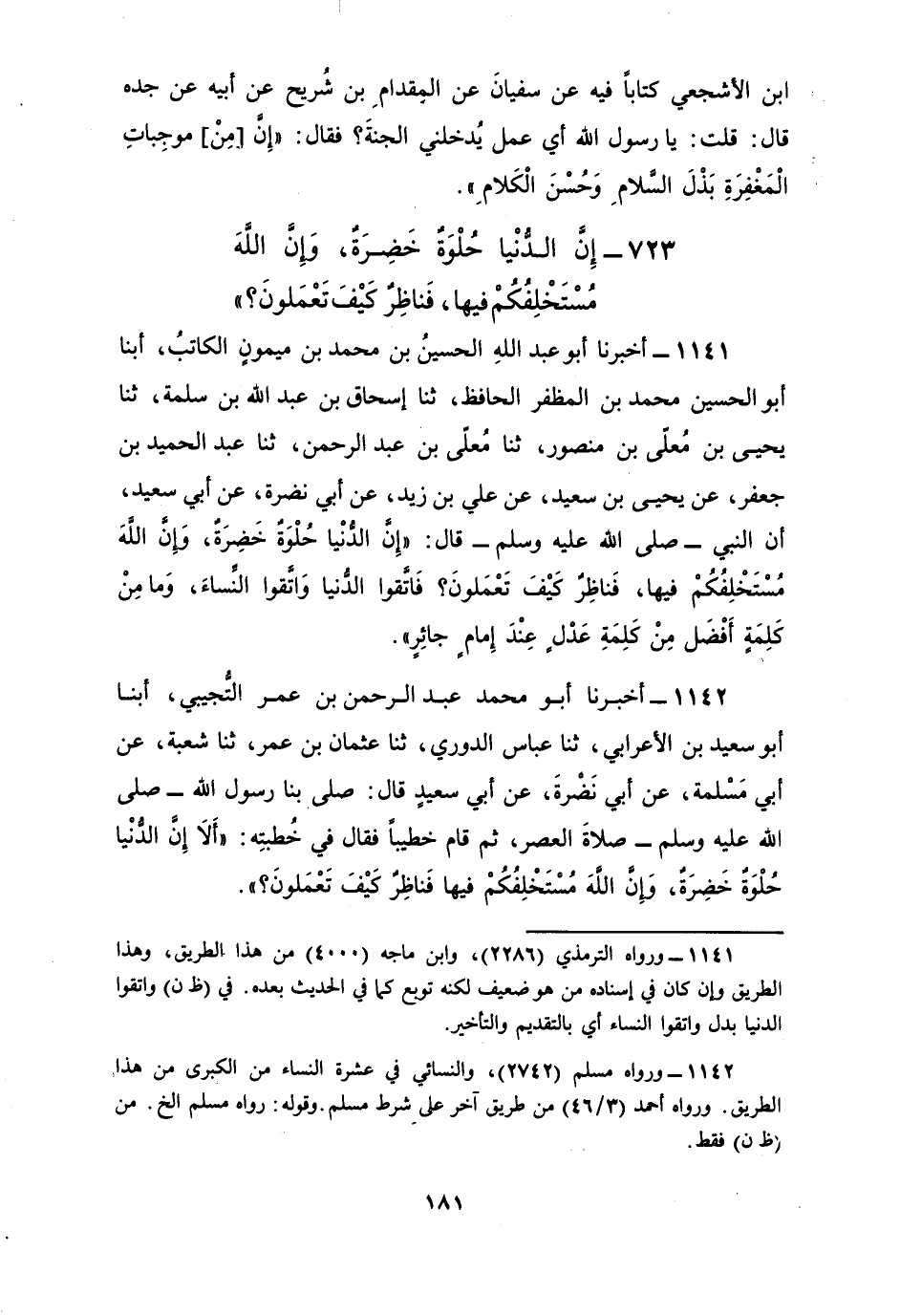 1141 - أَخْبَرَنَا أَبُو عَبْدِ اللَّهِ الْحُسَيْنُ بْنُ مُحَمَّدِ بْنِ مَيْمُونٍ الْكَاتِبُ، أبنا أَبُو الْحُسَيْنِ مُحَمَّدُ بْنُ الْمُظَفَّرِ الْحَافِظُ، ثنا إِسْحَاقُ بْنُ عَبْدِ اللَّهِ بْنِ سَلَمَةَ، ثنا يَحْيَى بْنُ مُعَلَّى بْنِ مَنْصُورٍ، ثنا مُعَلَّى بْنُ عَبْدِ الرَّحْمَنِ، ثنا عَبْدُ الْحَمِيدِ بْنُ جَعْفَرٍ، عَنْ يَحْيَى بْنِ سَعِيدٍ، عَنْ عَلِيِّ بْنِ زَيْدٍ، عَنْ أَبِي نَضْرَةَ، عَنْ أَبِي سَعِيدٍ، أَنَّ النَّبِيَّ صَلَّى اللهُ عَلَيْهِ وَسَلَّمَ قَالَ: «§إِنَّ الدُّنْيَا حُلْوَةٌ خَضِرَةٌ، وَإِنَّ اللَّهَ مُسْتَخْلِفُكُمْ فِيهَا، فَنَاظِرٌ كَيْفَ تَعْمَلُونَ، فَاتَّقُوا الدُّنْيَا، وَاتَّقُوا النِّسَاءَ، وَمَا مِنْ كَلِمَةٍ أَفْضَلَ مِنْ كَلِمَةِ عَدْلٍ عِنْدَ إِمَامٍ جَائِرٍ»