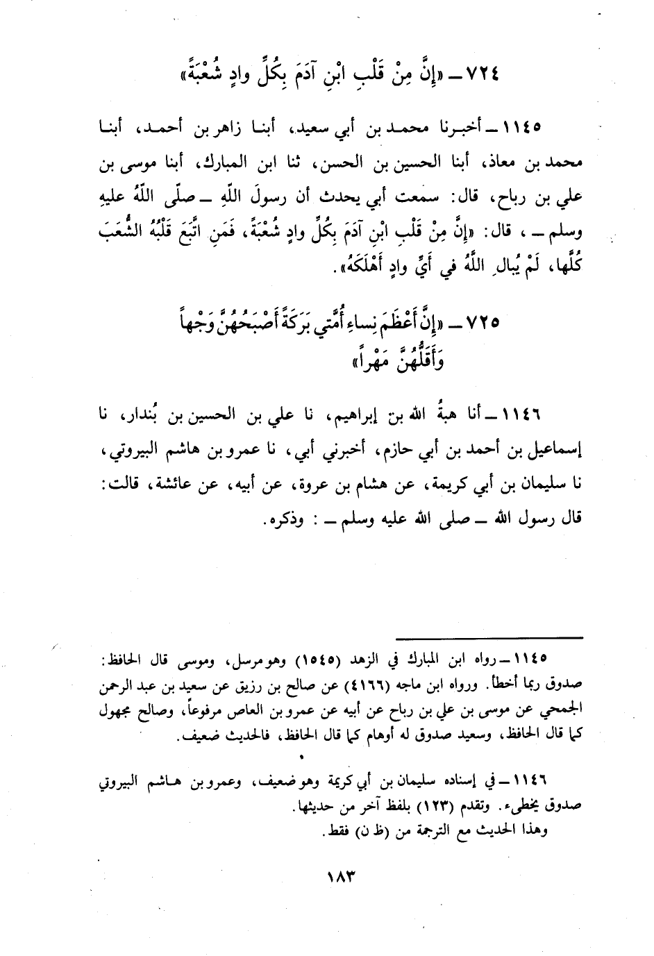 1145 - أَخْبَرَنَا مُحَمَّدُ بْنُ أَبِي سَعِيدٍ، أبنا زَاهِرُ بْنُ أَحْمَدَ، أبنا مُحَمَّدُ بْنُ مُعَاذٍ، أبنا الْحُسَيْنُ بْنُ الْحَسَنِ، ثنا ابْنُ الْمُبَارَكِ، أبنا مُوسَى بْنُ عَلِيِّ بْنِ رَبَاحٍ، قَالَ: سَمِعْتُ أَبِي يُحَدِّثُ، أَنَّ رَسُولَ اللَّهِ صَلَّى اللهُ عَلَيْهِ وَسَلَّمَ قَالَ: §«إِنَّ مِنْ قَلْبِ ابْنِ آدَمَ بِكُلِّ وَادٍ شُعْبَةً، فَمَنِ اتَّبَعَ قَلْبُهُ الشِّعَبَ كُلَّهَا لَمْ يُبَالِ اللَّهُ فِي أَيِّ وَادٍ أَهْلَكَهُ»
