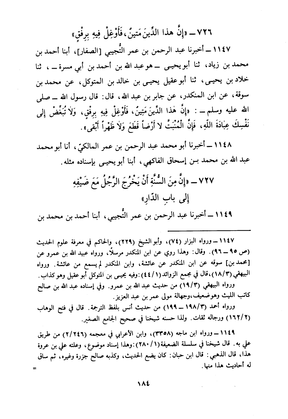 1147 - أَخْبَرَنَا عَبْدُ الرَّحْمَنِ بْنُ عُمَرَ التُّجِيبِيُّ الصَّفَّارُ، أبنا أَحْمَدُ بْنُ مُحَمَّدِ بْنِ زِيَادٍ، ثنا أَبُو يَحْيَى هُوَ عَبْدُ اللَّهِ بْنُ أَحْمَدَ بْنِ أَبِي مَسَرَّةَ، ثنا خَلَّادُ بْنُ يَحْيَى، ثنا أَبُو عَقِيلٍ يَحْيَى بْنُ خَالِدِ بْنِ الْمُتَوَكِّلِ، عَنْ مُحَمَّدِ بْنِ سُوقَةَ، عَنِ ابْنِ الْمُنْكَدِرِ، عَنْ جَابِرِ بْنِ عَبْدِ اللَّهِ، قَالَ: قَالَ رَسُولُ اللَّهِ صَلَّى اللهُ عَلَيْهِ وَسَلَّمَ: «إِنَّ §هَذَا الدِّينَ مَتِينٌ فَأَوْغِلْ فِيهِ بِرِفْقٍ، وَلَا تُبَغِّضْ إِلَى نَفْسِكَ عُبَادَةَ اللَّهِ، فَإِنَّ الْمُنْبَتَّ لَا أَرْضًا قَطَعَ وَلَا ظَهْرًا أَبْقَى»