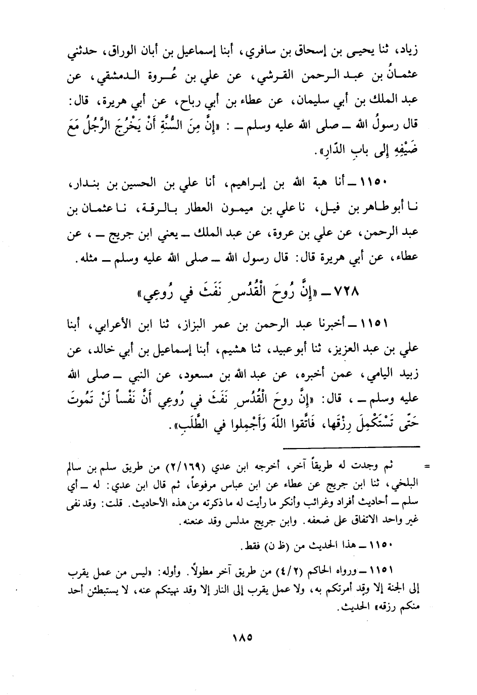 1151 - أَخْبَرَنَا عَبْدُ الرَّحْمَنِ بْنُ عُمَرَ الْبَزَّازُ، ثنا ابْنُ الْأَعْرَابِيِّ، أبنا عَلِيُّ بْنُ عَبْدِ الْعَزِيزِ، ثنا أَبُو عُبَيْدٍ، ثنا هُشَيْمٌ، أبنا إِسْمَاعِيلُ بْنُ أَبِي خَالِدٍ، عَنْ زُبَيْدٍ الْيَامِيِّ، عَمَّنْ أَخْبَرَهُ عَنْ عَبْدِ اللَّهِ بْنِ مَسْعُودٍ، عَنِ النَّبِيِّ صَلَّى اللهُ عَلَيْهِ وَسَلَّمَ قَالَ: «إِنَّ رُوحَ الْقُدُسِ §نَفَثَ فِي رُوعِي أَنَّ نَفْسًا لَنْ تَمُوتَ حَتَّى تَسْتَكْمِلَ رِزْقَهَا، فَاتَّقُوا اللَّهَ وَأَجْمِلُوا فِي الطَّلَبِ»