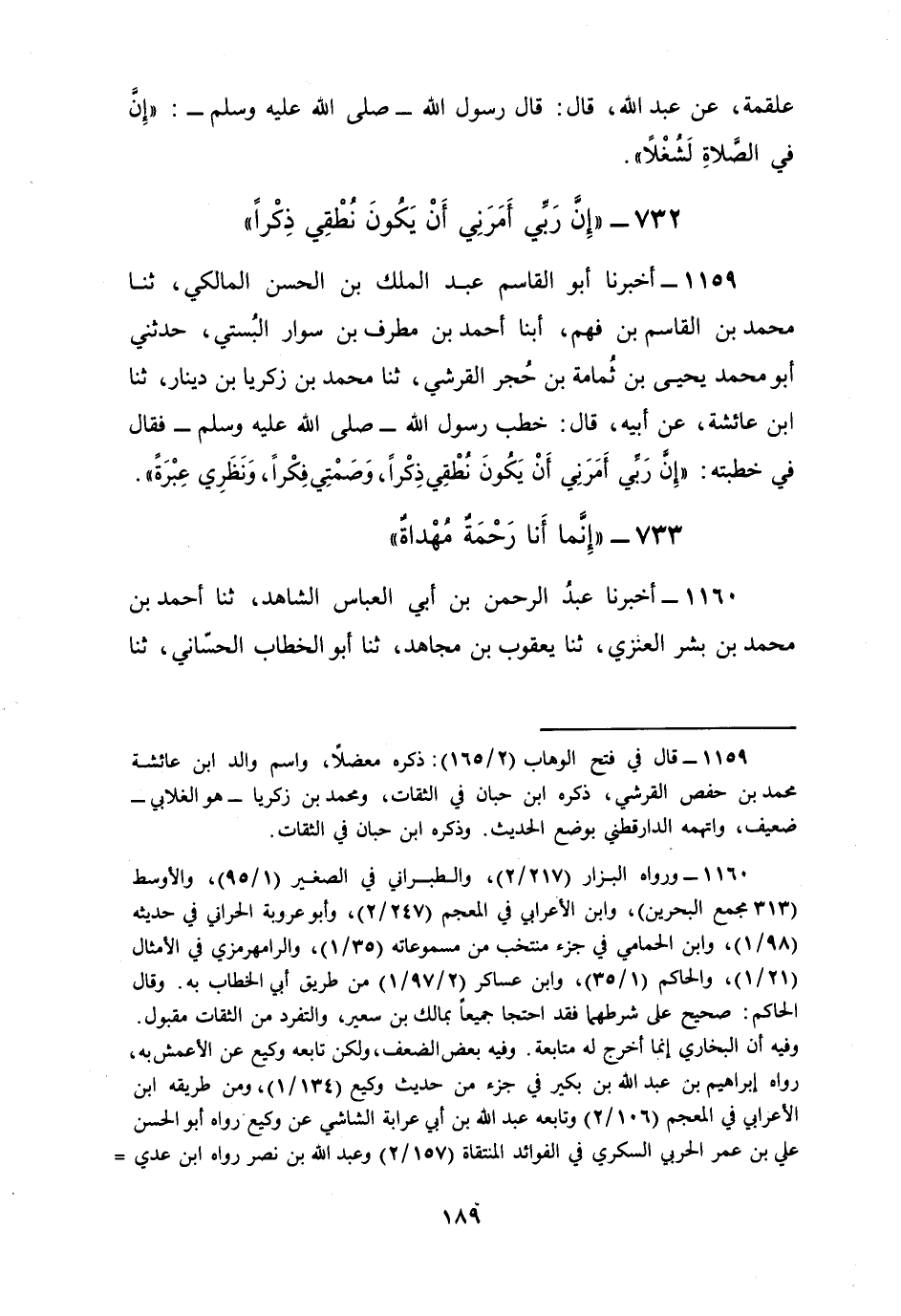 1159 - أَخْبَرَنَا أَبُو الْقَاسِمِ عَبْدُ الْمَلِكِ بْنُ الْحَسَنِ الْمَالِكِيُّ، ثنا مُحَمَّدُ بْنُ الْقَاسِمِ بْنِ فَهْمٍ، أبنا أَحْمَدُ بْنُ مُطَرِّفِ بْنِ سَوَّارٍ الْبَسْتِيُّ، حَدَّثَنِي أَبُو مُحَمَّدٍ، يَحْيَى بْنُ ثُمَامَةَ بْنِ حُجْرٍ الْقُرَشِيُّ، ثنا مُحَمَّدُ بْنُ زَكَرِيَّا بْنِ دِينَارٍ، ثنا ابْنُ عَائِشَةَ، عَنْ أَبِيهِ، قَالَ: خَطَبَ رَسُولُ اللَّهِ صَلَّى اللهُ عَلَيْهِ وَسَلَّمَ، فَقَالَ فِي خُطْبَتِهِ: «إِنَّ رَبِّي §أَمَرَنِي أَنْ يَكُونَ نُطْقِي ذِكْرًا، وَصَمْتِي فِكْرًا وَنَظَرِي عِبْرَةً»