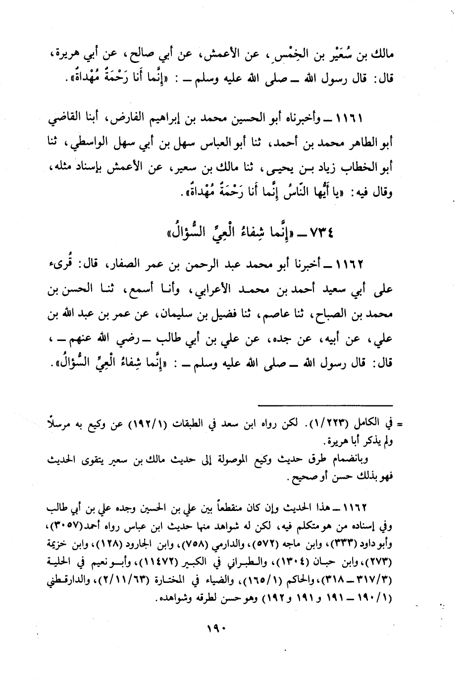 1162 - أَخْبَرَنَا أَبُو مُحَمَّدٍ عَبْدُ الرَّحْمَنِ بْنُ عُمَرَ الصَّفَّارُ، قَالَ: قُرِئَ عَلَى أَبِي سَعِيدٍ أَحْمَدَ بْنِ مُحَمَّدٍ الْأَعْرَابِيِّ وَأَنَا أَسْمَعُ، ثنا الْحَسَنُ بْنُ مُحَمَّدِ بْنِ الصَّبَّاحِ، ثنا عَاصِمٌ، ثنا فُضَيْلُ بْنُ سُلَيْمَانَ، عَنْ عُبَيْدِ اللَّهِ بْنِ مُحَمَّدِ بْنِ عُمَرَ بْنِ عَلِيٍّ، عَنْ أَبِيهِ، عَنْ جَدِّهِ، عَنْ عَلِيِّ بْنِ أَبِي طَالِبٍ رَضِيَ اللَّهُ عَنْهُمْ قَالَ: قَالَ رَسُولُ اللَّهِ صَلَّى اللهُ عَلَيْهِ وَسَلَّمَ: «إِنَّمَا §شِفَاءُ الْعِيِّ السُّؤَالُ»