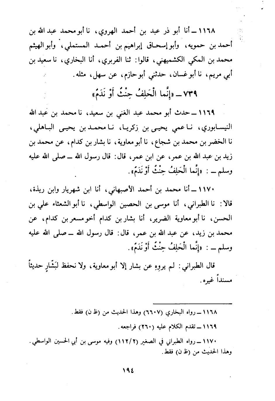 1170 - أنا مُحَمَّدُ بْنُ أَحْمَدَ الْأَصْبَهَانِيُّ، أنا ابْنُ شَهْرَيَارَ، وَابْنُ رِيذَةَ قَالَا: نا الطَّبَرَانِيُّ، أنا مُوسَى بْنُ الْحُصَيْنِ الْوَاسِطِيُّ، نا أَبُو الشَّعْثَاءِ، عَلِيُّ بْنُ الْحَسَنِ، نا أَبُو مُعَاوِيَةَ الضَّرِيرُ، أنا بَشَّارُ بْنُ كِدَامٍ، أَخُو مِسْعَرِ بْنِ كِدَامٍ، عَنْ مُحَمَّدِ بْنِ زَيْدٍ، عَنْ عَبْدِ اللَّهِ بْنِ عُمَرَ، قَالَ: قَالَ رَسُولُ اللَّهِ صَلَّى اللهُ عَلَيْهِ وَسَلَّمَ: «إِنَّمَا §الْحَلِفُ حِنْثٌ أَوْ نَدَمٌ» قَالَ الطَّبَرَانِيُّ: لَمْ يَرْوِهِ عَنْ بَشَّارٍ إِلَّا أَبُو مُعَاوِيَةُ، وَلَا نَحْفَظُ لِبَشَّارٍ حَدِيثًا مُسْنَدًا غَيْرَهُ