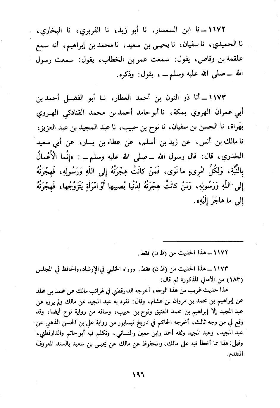 1173 - أنا ذُو النُّونِ بْنُ أَحْمَدَ الْعَطَّارُ، نا أَبُو الْفَضْلِ، أَحْمَدُ بْنُ أَبِي عِمْرَانَ الْهَرَوِيُّ بِمَكَّةَ، نا أَبُو حَامِدٍ، أَحْمَدُ بْنُ مُحَمَّدٍ الْقَنَادِكِيُّ الْهَرَوِيُّ بِهَرَاةَ، نا الْحَسَنُ بْنُ سُفْيَانَ، نا نُوحُ بْنُ حَبِيبٍ، نا عَبْدُ الْمَجِيدِ بْنُ عَبْدِ الْعَزِيزِ، نا مَالِكُ بْنُ أَنَسٍ، عَنْ زَيْدِ بْنِ أَسْلَمَ، عَنْ عَطَاءِ بْنِ يَسَارٍ، عَنْ أَبِي سَعِيدٍ الْخُدْرِيِّ، قَالَ: قَالَ رَسُولُ اللَّهِ صَلَّى اللهُ عَلَيْهِ وَسَلَّمَ: «إِنَّمَا §الْأَعْمَالُ بِالنِّيَّةِ، وَلِكُلِّ امْرِئٍ مَا نَوَى، فَمَنْ كَانَتْ هِجْرَتُهُ إِلَى اللَّهِ وَرَسُولِهِ فَهِجْرَتُهُ إِلَى اللَّهِ وَرَسُولِهِ، وَمَنْ كَانَتْ هِجْرَتُهُ لِدُنْيَا يُصِيبُهَا أَوِ امْرَأَةٍ يَتَزَوَّجُهَا فَهِجْرَتُهُ إِلَى مَا هَاجَرَ إِلَيْهِ»