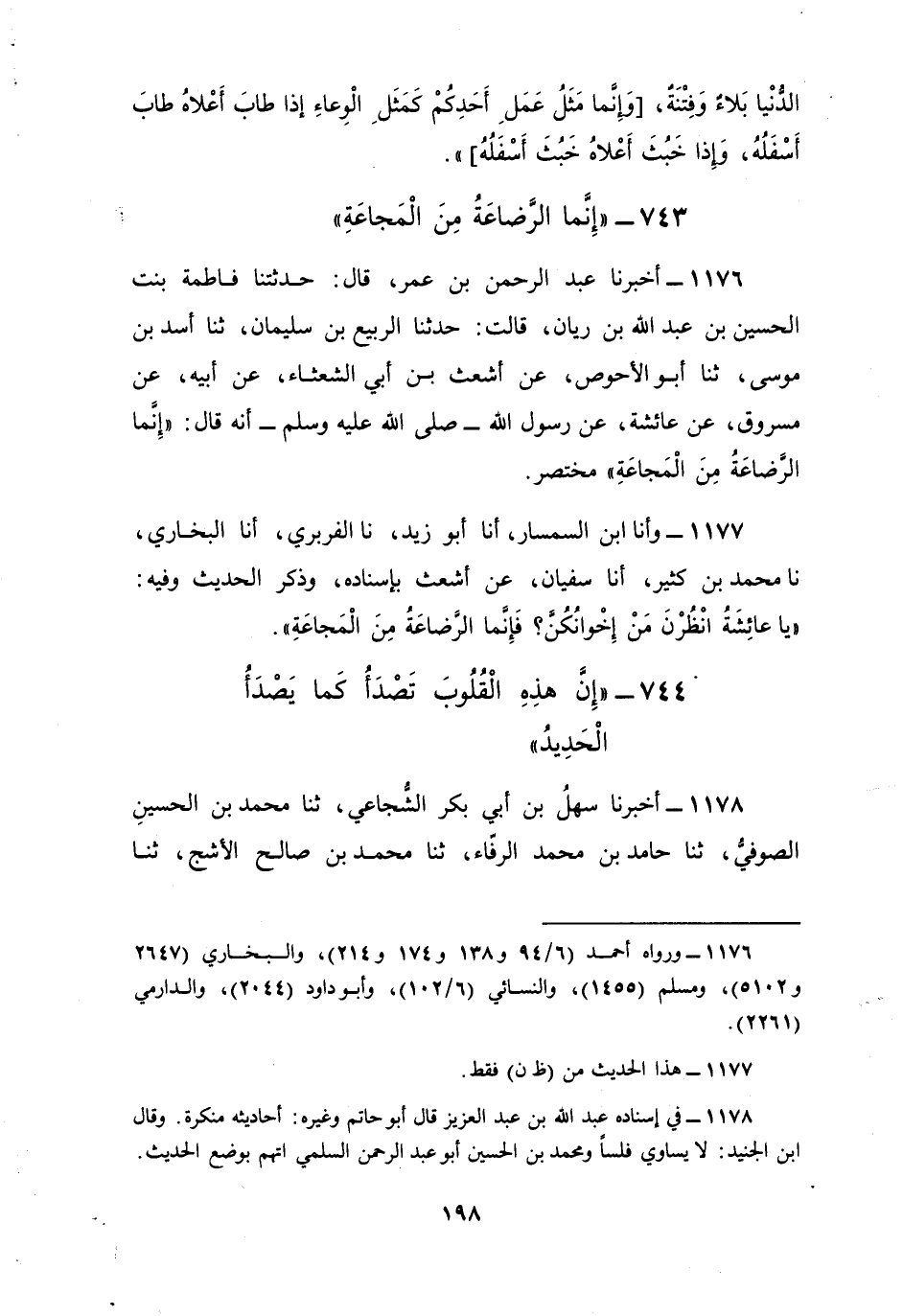 1176 - أَخْبَرَنَا عَبْدُ الرَّحْمَنِ بْنُ عُمَرَ، قَالَ: حَدَّثَتْنَا فَاطِمَةُ بِنْتُ الْحُسَيْنِ بْنِ عَبْدِ اللَّهِ بْنِ رَيَّانَ، قَالَتْ: حَدَّثَنَا الرَّبِيعُ بْنُ سُلَيْمَانَ، ثنا أَسَدُ بْنُ مُوسَى، ثنا أَبُو الْأَحْوَصِ، عَنْ أَشْعَثَ بْنِ أَبِي الشَّعْثَاءِ، عَنْ أَبِيهِ، عَنْ مَسْرُوقٍ، عَنْ عَائِشَةَ، عَنْ رَسُولِ اللَّهِ صَلَّى اللهُ عَلَيْهِ وَسَلَّمَ أَنَّهُ قَالَ: «إِنَّمَا §الرَّضَاعَةُ مِنَ الْمَجَاعَةِ» مُخْتَصَرٌ