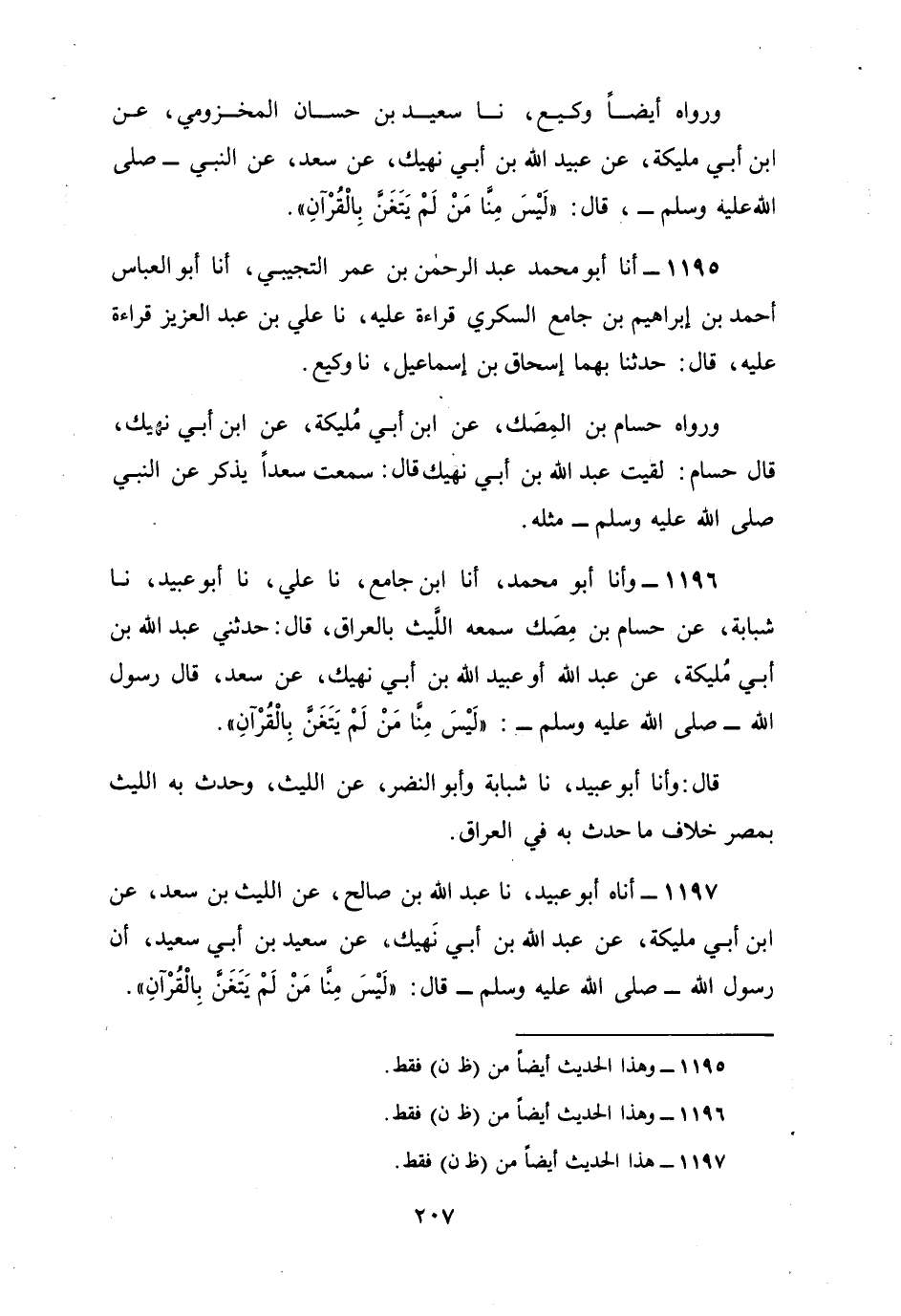 1197 - أَنَاهُ أَبُو عُبَيْدٍ، نا عَبْدُ اللَّهِ بْنُ صَالِحٍ، عَنِ اللَّيْثِ بْنِ سَعْدٍ عَنِ ابْنِ أَبِي مُلَيْكَةَ، عَنْ عَبْدِ اللَّهِ بْنِ أَبِي نَهِيكٍ، عَنْ سَعِيدِ بْنِ أَبِي سَعِيدٍ، أَنَّ رَسُولَ اللَّهِ صَلَّى اللهُ عَلَيْهِ وَسَلَّمَ قَالَ: §«لَيْسَ مِنَّا مَنْ لَمْ يَتَغَنَّ بِالْقُرْآنِ»