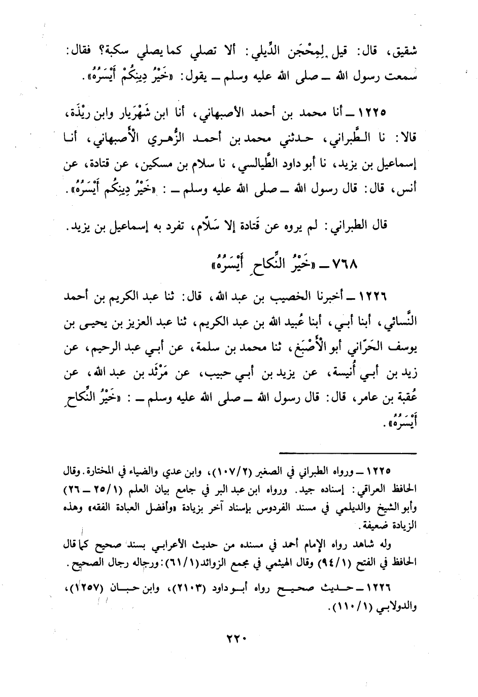 1225 - أنا مُحَمَّدُ بْنُ أَحْمَدَ الْأَصْبَهَانِيُّ، أنا ابْنُ شَهْرَيَارَ، وَابْنُ رِيذَةَ، قَالَ: أنا الطَّبَرَانِيُّ، حَدَّثَنِي مُحَمَّدُ بْنُ أَحْمَدَ الزُّهْرِيُّ الْأَصْبَهَانِيُّ، أنا إِسْمَاعِيلُ بْنُ يَزِيدَ، نا أَبُو دَاوُدَ الطَّيَالِسِيُّ، نا سَلَّامُ بْنُ مِسْكِينٍ، عَنْ قَتَادَةَ، عَنْ أَنَسٍ، قَالَ: قَالَ رَسُولُ اللَّهِ صَلَّى اللهُ عَلَيْهِ وَسَلَّمَ: «§خَيْرُ دِينِكُمْ أَيْسَرُهُ» قَالَ الطَّبَرَانِيُّ: لَمْ يَرْوِهِ عَنْ قَتَادَةَ إِلَّا سَلَّامٌ، تَفَرَّدَ بِهِ إِسْمَاعِيلُ بْنُ يَزِيدَ