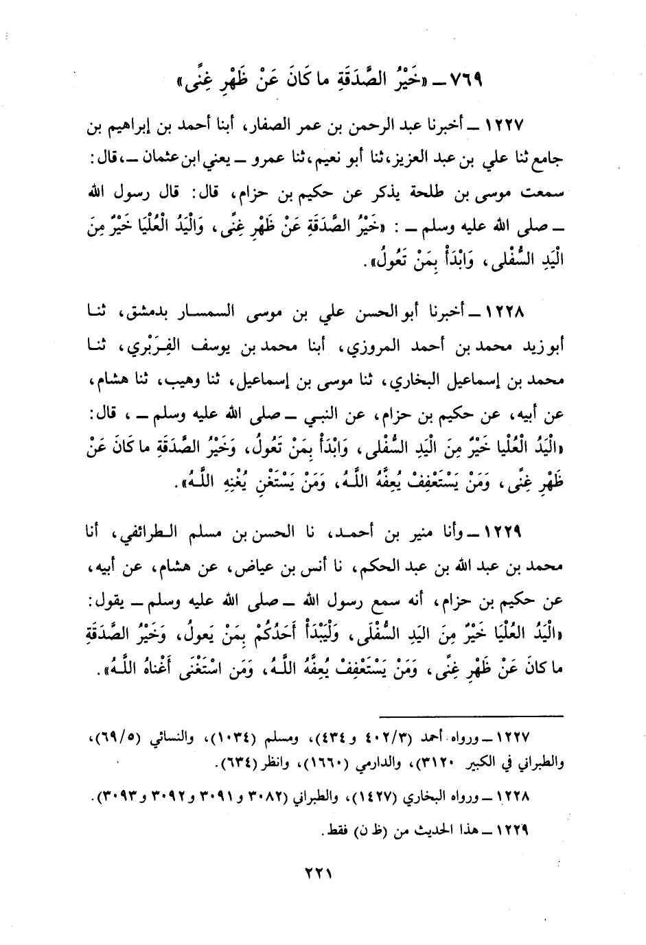 1227 - أَخْبَرَنَا عَبْدُ الرَّحْمَنِ بْنُ عُمَرَ الصَّفَّارُ، أبنا أَحْمَدُ بْنُ إِبْرَاهِيمَ بْنِ جَامِعٍ، ثنا عَلِيُّ بْنُ عَبْدِ الْعَزِيزِ، ثنا أَبُو نُعَيْمٍ، ثنا عَمْرٌو، يَعْنِي ابْنَ عُثْمَانَ، قَالَ: سَمِعْتُ مُوسَى بْنَ طَلْحَةَ، يَذْكُرُ عَنْ حَكِيمِ بْنِ حِزَامٍ، قَالَ: قَالَ رَسُولُ اللَّهِ صَلَّى اللهُ عَلَيْهِ وَسَلَّمَ: «§خَيْرُ الصَّدَقَةِ عَنْ ظَهْرِ غِنًى، وَالْيَدُ الْعُلْيَا خَيْرٌ مِنَ الْيَدِ السُّفْلَى، وَابْدَأْ بِمَنْ تَعُولُ»