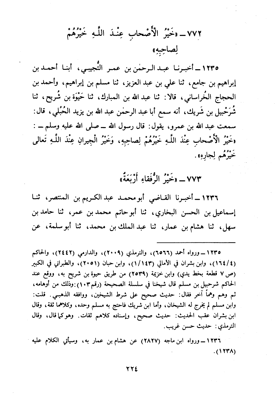 1235 - أَخْبَرَنَا عَبْدُ الرَّحْمَنِ بْنُ عُمَرَ التُّجِيبِيُّ، أبنا أَحْمَدُ بْنُ إِبْرَاهِيمَ بْنِ جَامِعٍ، ثنا عَلِيُّ بْنُ عَبْدِ الْعَزِيزِ، ثنا مُسْلِمُ بْنُ إِبْرَاهِيمَ، وَأَحْمَدُ بْنُ الْحَجَّاجِ الْخُرَاسَانِيُّ، قَالَا: ثنا عَبْدُ اللَّهِ بْنُ الْمُبَارَكِ، ثنا حَيْوَةُ بْنُ شُرَيْحٍ، ثنا شُرَحْبِيلُ بْنُ شَرِيكٍ، أَنَّهُ سَمِعَ أَبَا عَبْدَ الرَّحْمَنِ عَبْدَ اللَّهِ بْنَ يَزِيدَ الْحُبُلِيَّ، قَالَ: سَمِعْتُ عَبْدَ اللَّهِ بْنَ عَمْرٍو، يَقُولُ: قَالَ رَسُولُ اللَّهِ صَلَّى اللهُ عَلَيْهِ وَسَلَّمَ: «§خَيْرُ الْأَصْحَابِ عِنْدَ اللَّهِ خَيْرُهُمْ لِصَاحِبِهِ، وَخَيْرُ الْجِيرَانِ عِنْدَ اللَّهِ تَعَالَى خَيْرُهُمْ لِجَارِهِ»