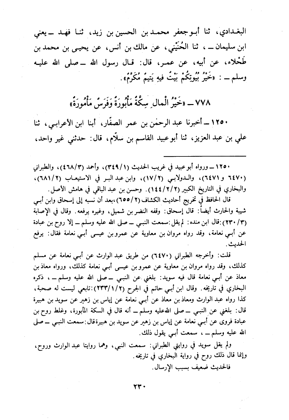 1250 - أَخْبَرَنَا عَبْدُ الرَّحْمَنِ بْنُ عُمَرَ الصَّفَّارُ، أبنا ابْنُ الْأَعْرَابِيِّ، ثنا عَلِيُّ بْنُ عَبْدِ الْعَزِيزِ، ثنا أَبُو عُبَيْدٍ الْقَاسِمُ بْنُ سَلَّامٍ، قَالَ: حَدَّثَنِي غَيْرُ وَاحِدٍ، عَنْ أَبِي نَعَامَةَ الْعَدَوِيِّ عَمْرِو بْنِ عِيسَى، عَنْ مُسْلِمِ بْنِ بُدَيْلٍ، عَنْ إِيَاسِ بْنِ زُهَيْرٍ، عَنْ سُوَيْدِ بْنِ هُبَيْرَةَ، عَنِ النَّبِيِّ صَلَّى اللهُ عَلَيْهِ وَسَلَّمَ أَنَّهُ قَالَ: §«خَيْرُ الْمَالِ سِكَّةٌ مَأْبُورَةٌ وَفَرَسٌ مَأْمُورَةٌ»
