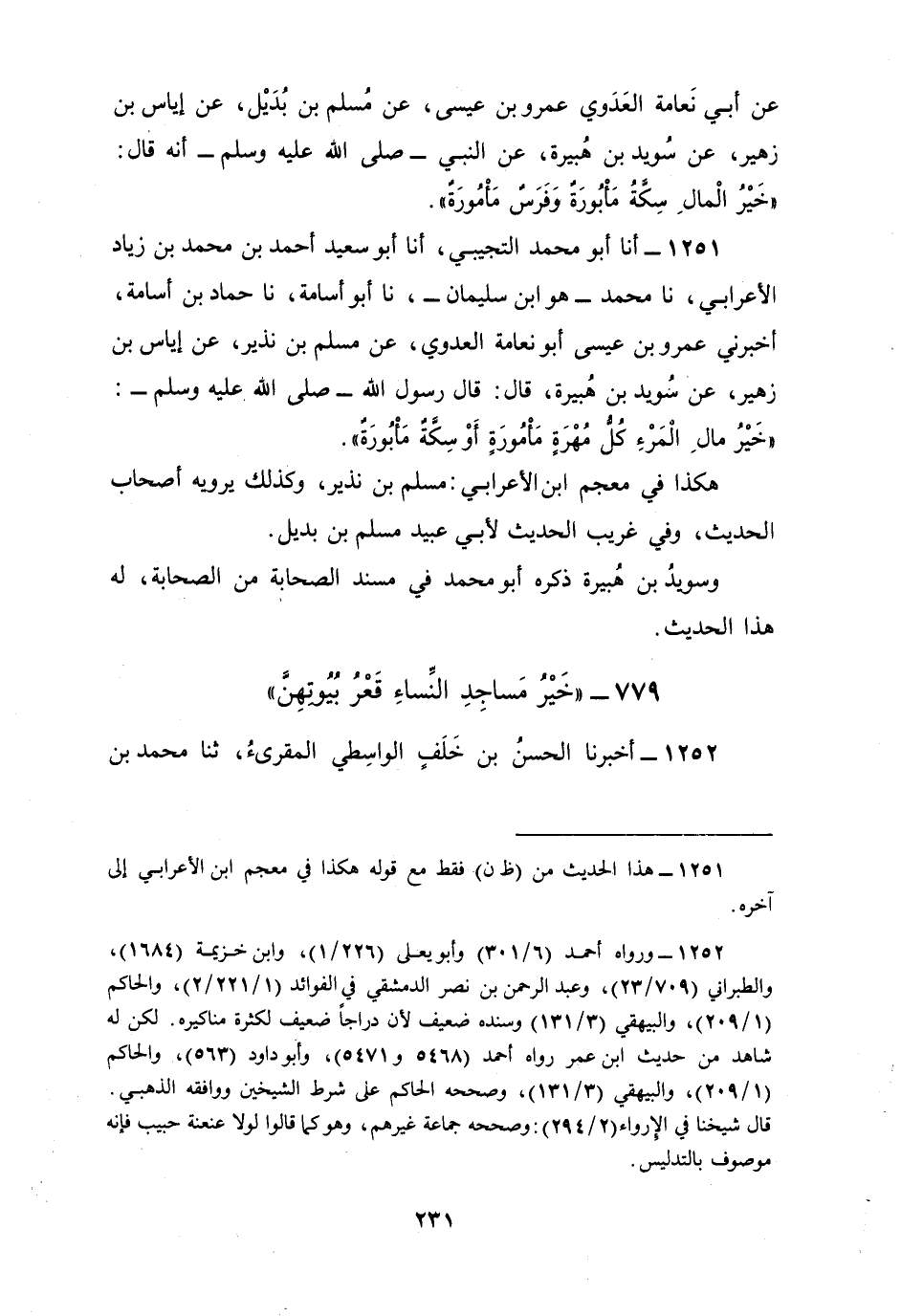 1251 - أنا أَبُو مُحَمَّدٍ التُّجِيبِيُّ، أنا أَبُو سَعِيدٍ، أَحْمَدُ بْنُ مُحَمَّدِ بْنِ زِيَادٍ الْأَعْرَابِيُّ، نا مُحَمَّدٌ، هُوَ ابْنُ سُلَيْمَانَ، نا أَبُو أُسَامَةَ، نا حَمَّادُ بْنُ أُسَامَةَ، أَخْبَرَنِي عَمْرُو بْنُ عِيسَى أَبُو نَعَامَةَ الْعَدَوِيُّ، عَنْ مُسْلِمِ بْنِ نَذِيرٍ، عَنْ إِيَاسِ بْنِ زُهَيْرٍ، عَنْ سُوَيْدِ بْنِ هُبَيْرَةَ، قَالَ: قَالَ رَسُولُ اللَّهِ صَلَّى اللهُ عَلَيْهِ وَسَلَّمَ: §«خَيْرُ مَالِ الْمَرْءِ كُلُّ مُهْرَةٍ مَأْمُورَةٍ أَوْ سِكَّةٍ مَأْبُورَةٍ» ، هَكَذَا فِي مُعْجَمِ ابْنِ الْأَعْرَابِيِّ مُسْلِمِ بْنِ نَذِيرٍ وَكَذَلِكَ يَرْوِيهِ أَصْحَابُ الْحَدِيثِ، وَفِي غَرِيبِ الْحَدِيثِ لِأَبِي عُبَيْدٍ مُسْلِمِ بْنِ بُدَيْلٍ وَسُوَيْدِ بْنِ هُبَيْرَةَ، ذَكَرَهُ أَبُو مُحَمَّدٍ فِي مُسْنَدِ الصَّحَابَةِ مِنَ الصَّحَابَةِ، لَهُ هَذَا الْحَدِيثُ
