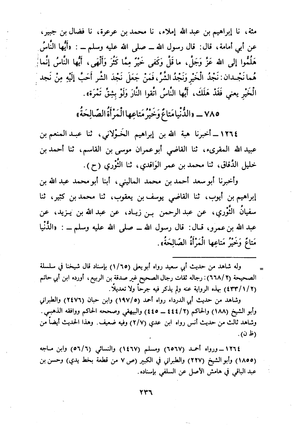 1264 - أَخْبَرَنَا هِبَةُ اللَّهِ بْنُ إِبْرَاهِيمَ الْخَوْلَانِيُّ، ثنا عَبْدُ الْمُنْعِمِ بْنُ عُبَيْدِ اللَّهِ الْمُقْرِئُ، ثنا الْقَاضِي أَبُو عِمْرَانَ، مُوسَى بْنُ الْقَاسِمِ، ثنا أَحْمَدُ بْنُ خَلِيلٍ الدَّقَّاقُ، ثنا مُحَمَّدُ بْنُ عُمَرَ الْوَاقِدِيُّ، ثنا الثَّوْرِيُّ، ح. وَأَخْبَرَنَا أَبُو سَعْدٍ، أَحْمَدُ بْنُ مُحَمَّدٍ الْمَالِينِي، أبنا أَبُو مُحَمَّدٍ عَبْدُ اللَّهِ بْنُ إِبْرَاهِيمَ بْنِ أَيُّوبَ، ثنا الْقَاضِي يُوسُفُ بْنُ يَعْقُوبَ، ثنا مُحَمَّدُ بْنُ كَثِيرٍ، ثنا سُفْيَانُ الثَّوْرِيُّ، عَنْ عَبْدِ الرَّحْمَنِ بْنِ زِيَادٍ، عَنْ عَبْدِ اللَّهِ بْنِ يَزِيدَ، عَنْ عَبْدِ اللَّهِ بْنِ عَمْرٍو، قَالَ: قَالَ رَسُولُ اللَّهِ صَلَّى اللهُ عَلَيْهِ وَسَلَّمَ: §«الدُّنْيَا مَتَاعٌ وَخَيْرُ مَتَاعِهَا الْمَرْأَةُ الصَّالِحَةُ»