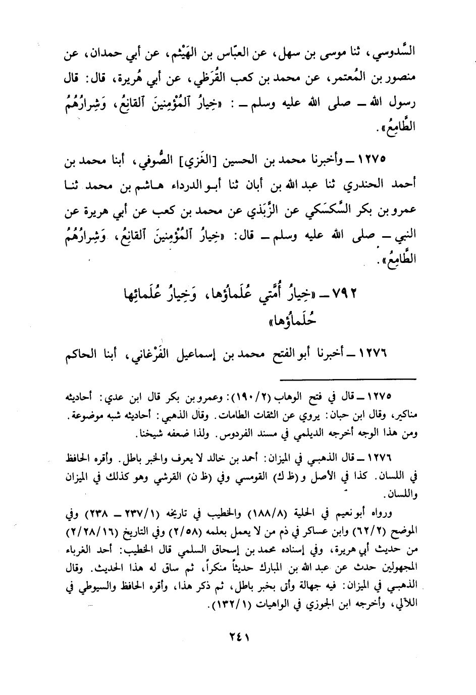 1276 - أَخْبَرَنَا أَبُو الْفَتْحِ مُحَمَّدُ بْنُ إِسْمَاعِيلَ الْفَرْغَانِيُّ، أبنا الْحَاكِمُ أَبُو عَبْدِ اللَّهِ مُحَمَّدُ بْنُ عَبْدِ اللَّهِ الْحَافِظُ، ثنا أَبُو مُحَمَّدٍ الْحَسَنُ بْنُ مُحَمَّدِ بْنِ إِسْحَاقَ الْأَزْهَرِيُّ، ثنا أَحْمَدُ بْنُ خَلِيلٍ الْقُومَسِيُّ، ثنا نُوحُ بْنُ حَبِيبٍ، ثنا ابْنُ مَسْلَمَةَ، عَنْ مَالِكٍ، عَنْ نَافِعٍ، عَنِ ابْنِ عُمَرَ، قَالَ: قَالَ رَسُولُ اللَّهِ صَلَّى اللهُ عَلَيْهِ وَسَلَّمَ: «§خِيَارُ أُمَّتِي عُلَمَاؤُهَا، وَخِيَارُ عُلَمَائِهَا حُلَمَاؤُهَا، إِلَّا وَإِنَّ اللَّهَ يَغْفِرُ لِلْعَالِمِ الرَّحِيمِ أَرْبَعِينَ ذَنْبًا قَبْلَ أَنْ يَغْفِرَ لِلجَّاهِلِ الْبَذِيءِ ذَنْبًا وَاحِدًا، وَإِنَّ الْعَالِمَ الرَّحِيمَ يَجِيءُ يَوْمَ الْقِيَامَةِ وَنُورُهُ قَدْ أَضَاءَ، فَيَسِيرُ فِيهِ كَمَا يَسِيرُ الْكَوْكَبُ الدُّرِّيُّ» قَالَ الْحَاكِمُ: ابْنُ مَسْلَمَةَ: مُحَمَّدُ بْنُ مَسْلَمَةَ الْمَدِينِيُّ، وَلَيْسَ بِالْقَعْنَبِيِّ