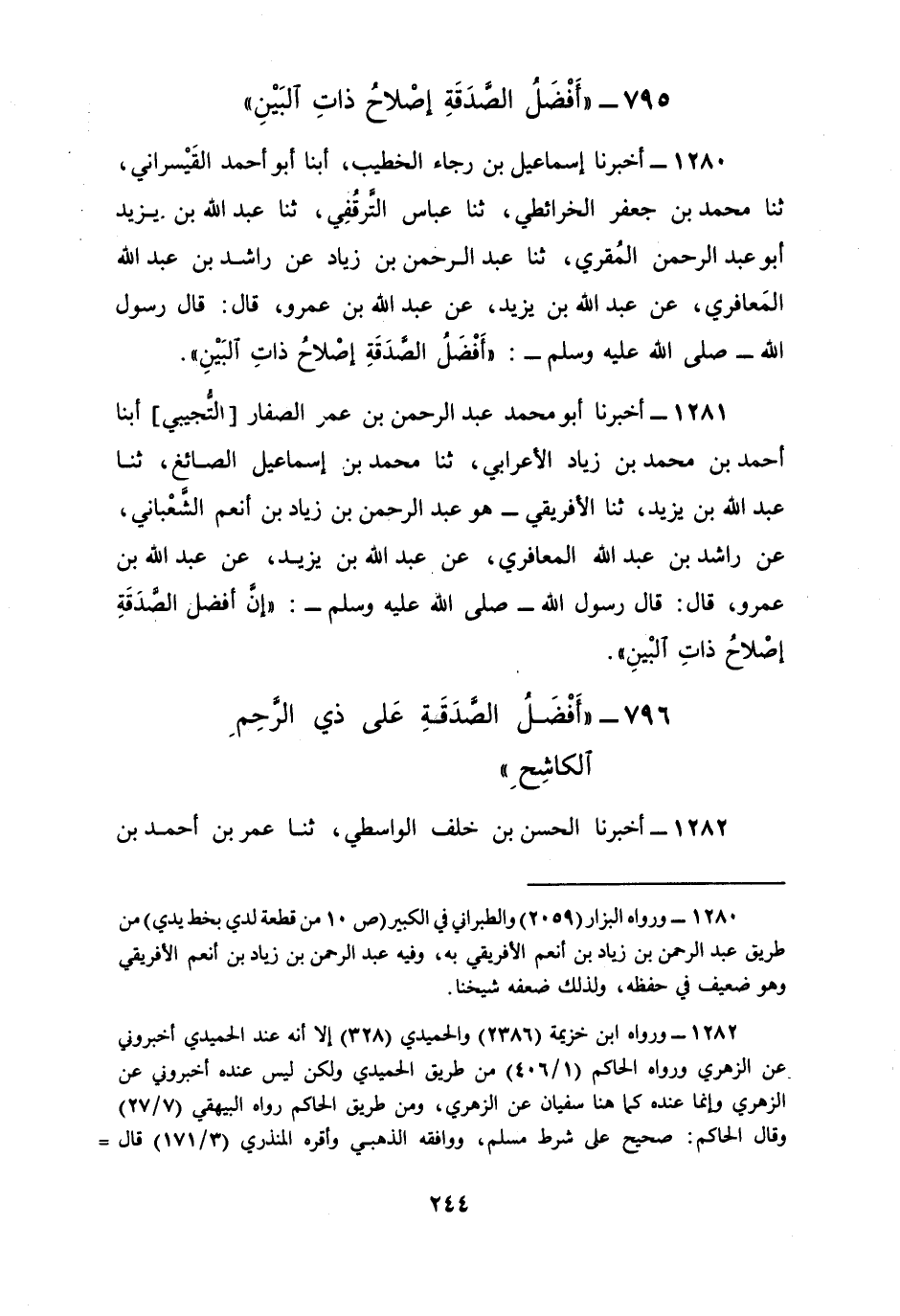 1280 - أَخْبَرَنَا إِسْمَاعِيلُ بْنُ رَجَاءٍ الْخَطِيبُ، أبنا أَبُو أَحْمَدَ الْقَيْسَرَانِيُّ، ثنا مُحَمَّدُ بْنُ جَعْفَرٍ الْخَرَائِطِيُّ، ثنا عَبَّاسٌ التَّرْقُفِيُّ، ثنا عَبْدُ اللَّهِ بْنُ يَزِيدَ أَبُو عَبْدِ الرَّحْمَنِ الْمُقْرِئُ، ثنا عَبْدُ الرَّحْمَنِ بْنُ زِيَادٍ، عَنْ رَاشِدِ بْنِ عَبْدِ اللَّهِ الْمَعَافِرِيِّ، عَنْ عَبْدِ اللَّهِ بْنِ يَزِيدَ، عَنْ عَبْدِ اللَّهِ بْنِ عَمْرٍو، قَالَ: قَالَ رَسُولُ اللَّهِ صَلَّى اللهُ عَلَيْهِ وَسَلَّمَ: §«أَفْضَلُ الصَّدَقَةِ إِصْلَاحُ ذَاتِ الْبَيِّنِ»
