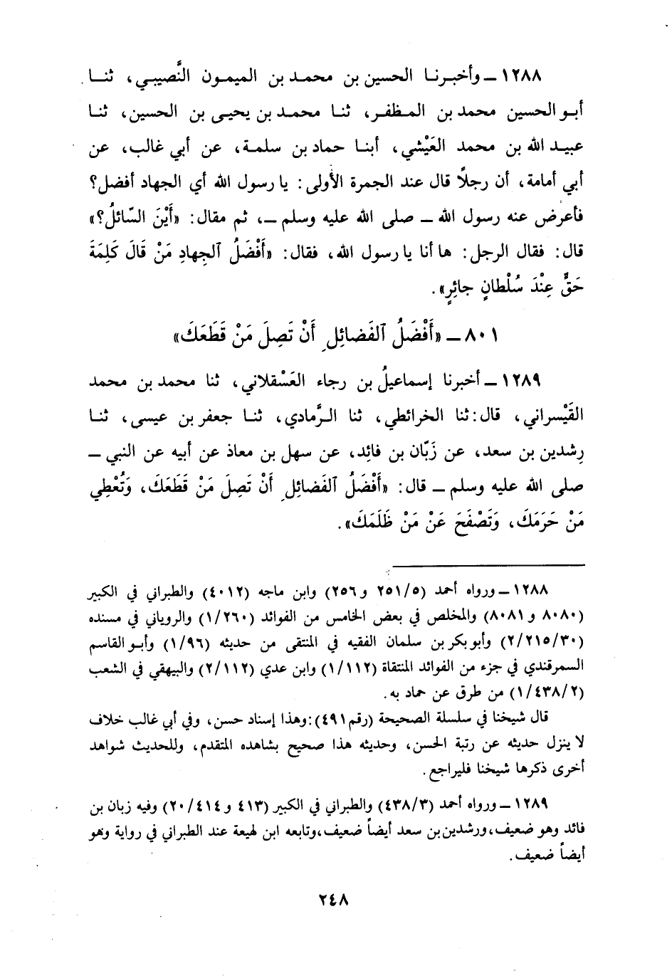1289 - أَخْبَرَنَا إِسْمَاعِيلُ بْنُ رَجَاءٍ الْعَسْقَلَانِيُّ، ثنا مُحَمَّدُ بْنُ مُحَمَّدٍ الْقَيْسَرَانِيُّ، قَالَ: ثنا الْخَرَائِطِيُّ، ثنا الرَّمَادِيُّ، ثنا جَعْفَرُ بْنُ عِيسَى، ثنا رِشْدِينُ بْنُ سَعْدٍ، عَنْ زَبَّانِ بْنِ فَائِدٍ، عَنْ سَهْلِ بْنِ مُعَاذٍ، عَنْ أَبِيهِ، عَنِ النَّبِيِّ صَلَّى اللهُ عَلَيْهِ وَسَلَّمَ قَالَ: «§أَفْضَلُ الْفَضَائِلِ أَنْ تَصِلَ مَنْ قَطَعَكَ، وَتُعْطِيَ مَنْ حَرَمَكَ، وَتَصْفَحَ عَمْن ظَلَمَكَ»