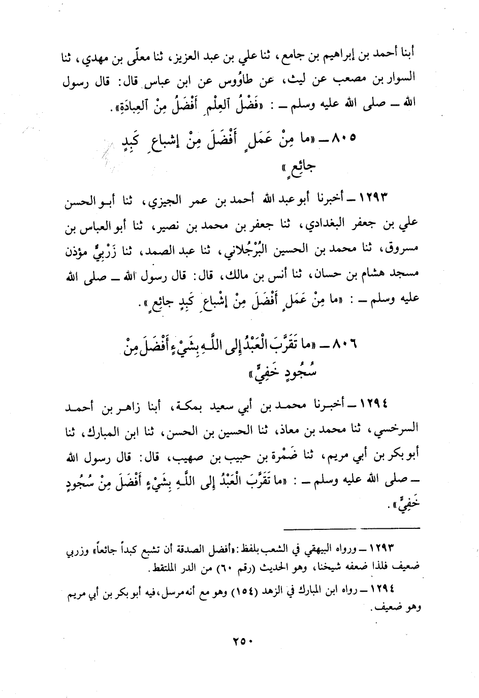 1293 - أَخْبَرَنَا أَبُو عَبْدِ اللَّهِ، أَحْمَدُ بْنُ عُمَرَ الْجِيزِيُّ، ثنا أَبُو الْحَسَنِ، عَلِيُّ بْنُ جَعْفَرَ الْبَغْدَادِيُّ، ثنا جَعْفَرُ بْنُ مُحَمَّدِ بْنِ نُصَيْرٍ، ثنا أَبُو الْعَبَّاسِ بْنُ مَسْرُوقٍ، ثنا مُحَمَّدُ بْنُ الْحُسَيْنِ الْبَرْجَلَانِيُّ، ثنا عَبْدُ الصَّمَدِ، ثنا زَرْبِيُّ، مُؤَذِّنُ مَسْجِدِ هِشَامِ بْنِ حَسَّانَ، ثنا أَنَسُ بْنُ مَالِكٍ، قَالَ: قَالَ رَسُولُ اللَّهِ صَلَّى اللهُ عَلَيْهِ وَسَلَّمَ: §«مَا مِنْ عَمَلٍ أَفْضَلَ مِنْ إِشْبَاعِ كَبِدٍ جَائِعٍ»