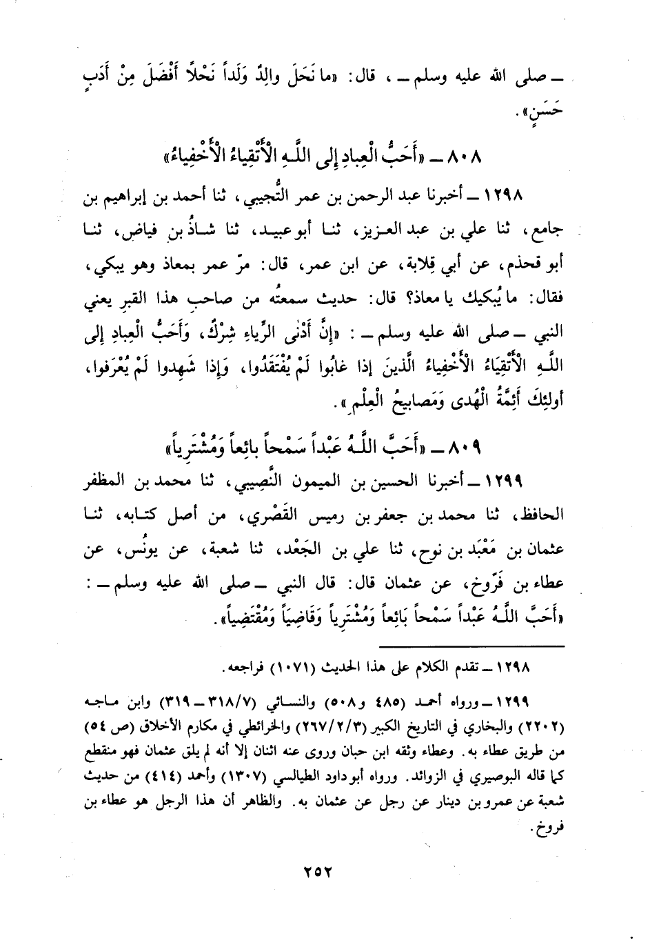1299 - أَخْبَرَنَا الْحُسَيْنُ بْنُ الْمَيْمُونِ النَّصِيبِيُّ، ثنا مُحَمَّدُ بْنُ الْمُظَفَّرِ الْحَافِظُ، ثنا مُحَمَّدُ بْنُ جَعْفَرِ بْنِ رُمَيْسٍ الْقَصْرِيُّ، مِنْ أَصْلِ كِتَابِهِ، ثنا عُثْمَانُ بْنُ مَعْبَدِ بْنِ نُوحٍ، ثنا عَلِيُّ بْنُ الْجَعْدِ، ثنا شُعْبَةُ، عَنْ يُونُسَ، عَنْ عَطَاءِ بْنِ فَرُّوخَ، عَنْ عُثْمَانَ، قَالَ: قَالَ النَّبِيُّ صَلَّى اللهُ عَلَيْهِ وَسَلَّمَ: «§أَحَبَّ اللَّهُ عَبْدًا سَمْحًا بَائِعًا وَمُشْتَرِيًا، وَقَاضِيًا وَمُقْتَضِيًا»