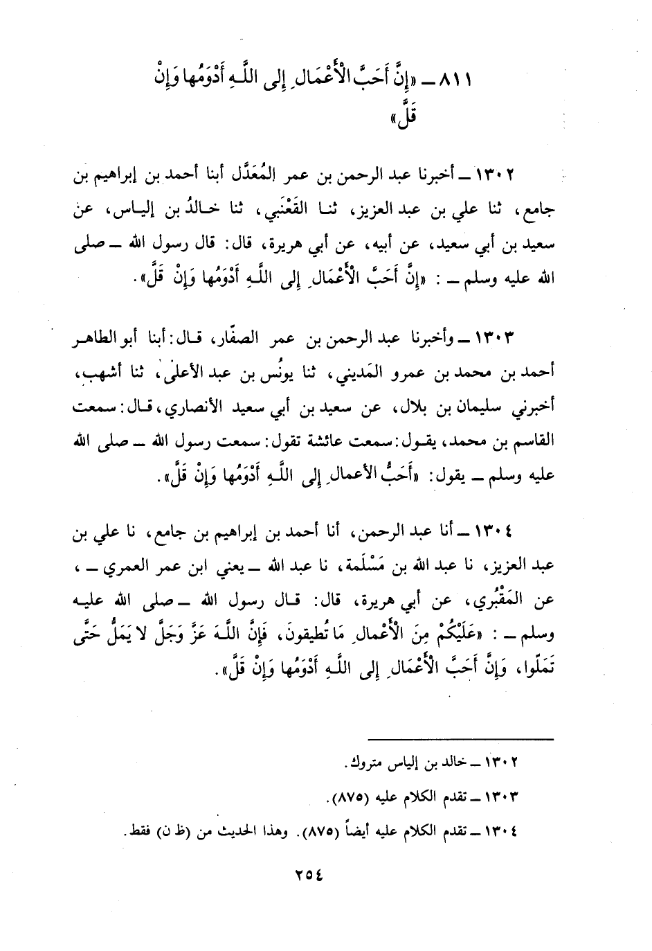 1302 - أَخْبَرَنَا عَبْدُ الرَّحْمَنِ بْنُ عُمَرَ الْمُعَدِّلُ، أبنا أَحْمَدُ بْنُ إِبْرَاهِيمَ بْنِ جَامِعٍ، ثنا عَلِيُّ بْنُ عَبْدِ الْعَزِيزِ، ثنا الْقَعْنَبِيُّ، ثنا خَالِدُ بْنُ إِلْيَاسَ، عَنْ سَعِيدِ بْنِ أَبِي سَعِيدٍ، عَنْ أَبِيهِ، عَنْ أَبِي هُرَيْرَةَ، قَالَ: قَالَ رَسُولُ اللَّهِ صَلَّى اللهُ عَلَيْهِ وَسَلَّمَ: «إِنَّ §أَحَبَّ الْأَعْمَالِ إِلَى اللَّهِ أَدْوَمُهَا وَإِنْ قَلَّ»