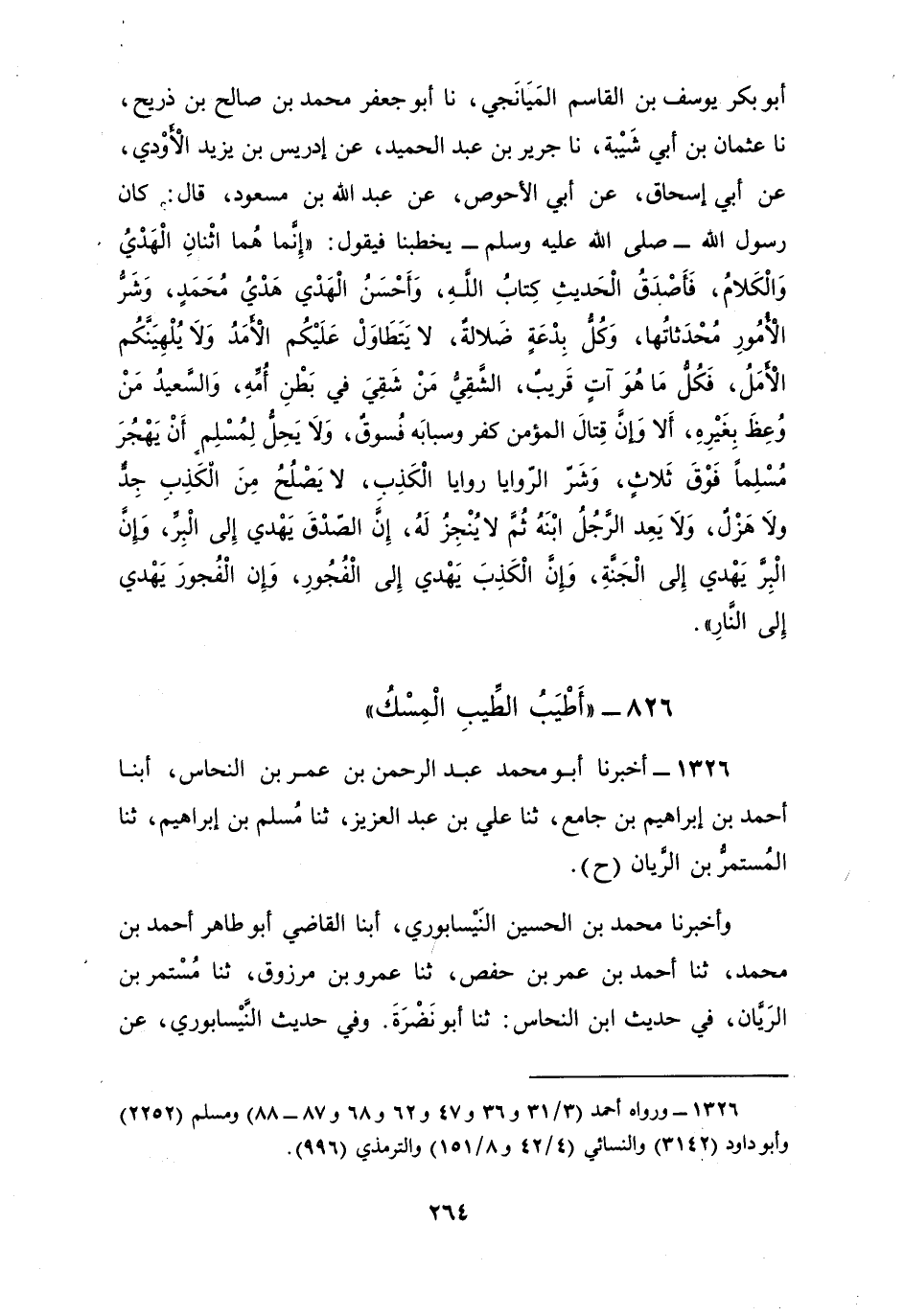1326 - أَخْبَرَنَا أَبُو مُحَمَّدٍ عَبْدُ الرَّحْمَنِ بْنُ عُمَرَ بْنِ النَّحَّاسِ، أبنا أَحْمَدُ بْنُ إِبْرَاهِيمَ بْنِ جَامِعٍ، ثنا عَلِيُّ بْنُ عَبْدِ الْعَزِيزِ، ثنا مُسْلِمُ بْنُ إِبْرَاهِيمَ، ثنا الْمُسْتَمِرُّ بْنُ الرَّيَّانِ، ح وَأَخْبَرَنَا مُحَمَّدُ بْنُ الْحُسَيْنِ النَّيْسَابُورِيُّ، أبنا الْقَاضِي أَبُو طَاهِرٍ أَحْمَدُ بْنُ مُحَمَّدٍ، ثنا أَحْمَدُ بْنُ عُمَرَ بْنِ حَفْصٍ، ثنا عَمْرُو بْنُ مَرْزُوقٍ، ثنا مُسْتَمِرُّ بْنُ الرَّيَّانِ، فِي حَدِيثِ ابْنِ النَّحَّاسِ: ثنا أَبُو نَضْرَةَ، وَفِي حَدِيثِ النَّيْسَابُورِيِّ: عَنْ أَبِي نَضْرَةَ، عَنْ أَبِي سَعِيدٍ الْخُدْرِيِّ، قَالَ: قَالَ رَسُولُ اللَّهِ صَلَّى اللهُ عَلَيْهِ وَسَلَّمَ: §«أَطْيَبُ الطِّيبِ الْمِسْكُ»