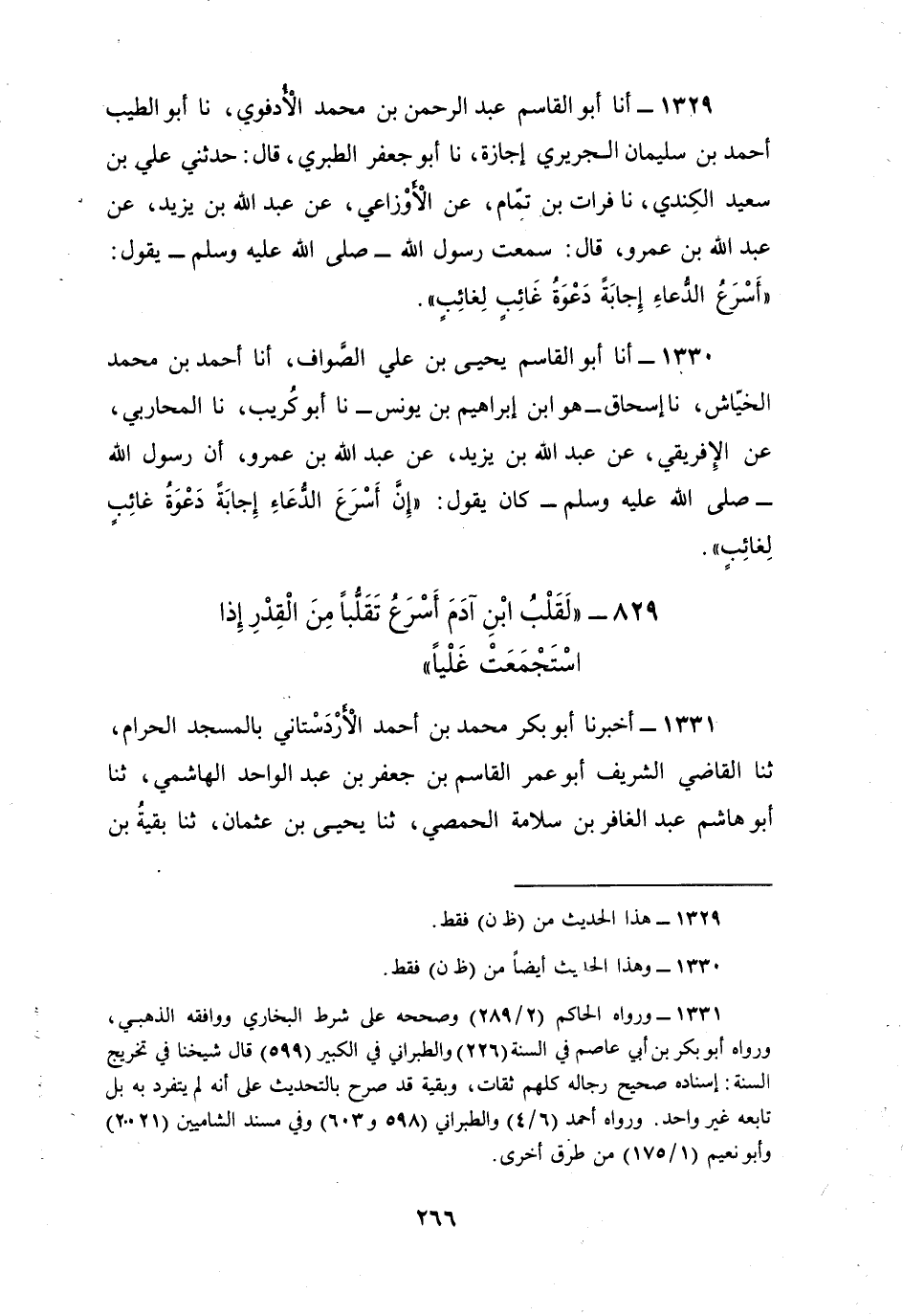 1329 - أنا أَبُو الْقَاسِمِ عَبْدُ الرَّحْمَنِ بْنُ مُحَمَّدٍ الْأُدْفُوِيُّ، نا أَبُو الطَّيِّبِ، أَحْمَدُ بْنُ سُلَيْمَانَ الْجُرَيْرِيُّ إِجَازَةً، نا أَبُو جَعْفَرٍ الطَّبَرِيُّ، قَالَ: حَدَّثَنِي عَلِيُّ بْنُ سَعِيدٍ الْكِنْدِيُّ، نا فُرَاتُ بْنُ تَمَامٍ، عَنِ الْأَوْزَاعِيِّ، عَنْ عَبْدِ اللَّهِ بْنِ يَزِيدَ، عَنْ عَبْدِ اللَّهِ بْنِ عَمْرٍو، قَالَ: سَمِعْتُ رَسُولَ اللَّهِ صَلَّى اللهُ عَلَيْهِ وَسَلَّمَ يَقُولُ: §«أَسْرَعُ الدُّعَاءِ إِجَابَةً دَعْوَةُ غَائِبٍ لِغَائِبٍ»