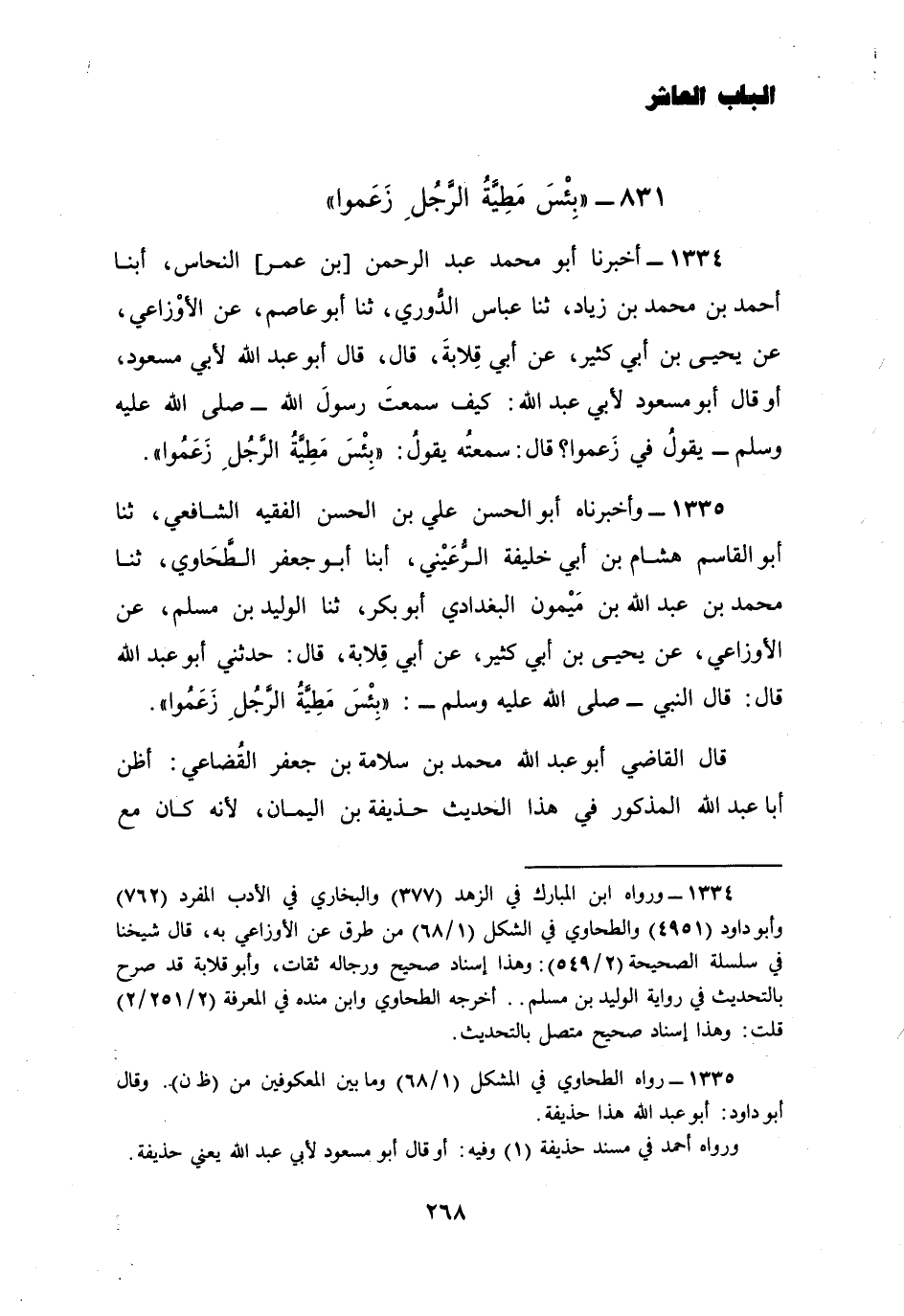 1335 - وَأَخْبَرَنَاهُ أَبُو الْحَسَنِ عَلِيُّ بْنُ الْحَسَنِ الْفَقِيهُ الشَّافِعِيُّ، ثنا أَبُو الْقَاسِمِ هِشَامُ بْنُ أَبِي خَلِيفَةَ الرُّعَيْنِيُّ، أبنا أَبُو جَعْفَرٍ الطَّحَاوِيُّ، ثنا مُحَمَّدُ بْنُ عَبْدِ اللَّهِ بْنِ مَيْمُونٍ الْبَغْدَادِيُّ أَبُو بَكْرٍ، ثنا الْوَلِيدُ بْنُ مُسْلِمٍ، عَنِ الْأَوْزَاعِيِّ، عَنْ يَحْيَى بْنِ أَبِي كَثِيرٍ، عَنْ أَبِي قِلَابَةَ، قَالَ: حَدَّثَنِي أَبُو عَبْدِ اللَّهِ، قَالَ: قَالَ النَّبِيُّ صَلَّى اللهُ عَلَيْهِ وَسَلَّمَ: §«بِئْسَ مَطِيَّةُ الرَّجُلِ زَعَمُوا» قَالَ الْقَاضِي أَبُو عَبْدِ اللَّهِ مُحَمَّدُ بْنُ سَلَامَةَ بْنِ جَعْفَرٍ الْقُضَاعِيُّ: أَظُنُّ أَبَا عَبْدِ اللَّهِ الْمَذْكُورَ فِي هَذَا الْحَدِيثِ حُذَيْفَةَ بْنَ الْيَمَانِ، لِأَنَّهُ كَانَ مَعَ أَبِي مَسْعُودٍ بِالْكُوفَةِ، وَكَانُوا يَتَجَالَسُونَ، وَيَسْأَلُ بَعْضُهُمْ بَعْضًا، وَكُنْيَةُ حُذَيْفَةَ أَبُو عَبْدِ اللَّهِ