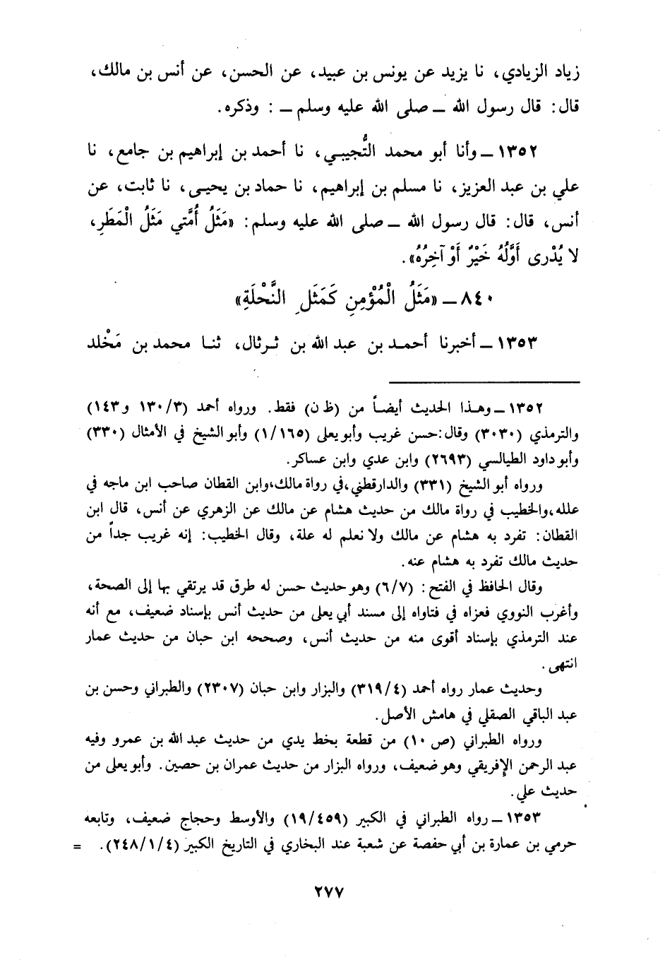 1352 - وأنا أَبُو مُحَمَّدٍ التُّجِيبِيُّ، نا أَحْمَدُ بْنُ إِبْرَاهِيمَ بْنِ جَامِعٍ، نا عَلِيُّ بْنُ عَبْدِ الْعَزِيزِ، نا مُسْلِمُ بْنُ إِبْرَاهِيمَ، نا حَمَّادُ بْنُ يَحْيَى، نا ثَابِتٌ، عَنْ أَنَسٍ، قَالَ: قَالَ رَسُولُ اللَّهِ صَلَّى اللهُ عَلَيْهِ وَسَلَّمَ: §«مَثَلُ أُمَّتِي مَثَلُ الْمَطَرِ لَا يُدْرَى أَوَّلُهُ خَيْرٌ أَوْ آخِرُهُ»