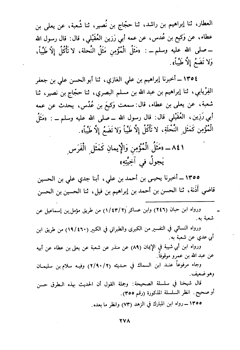 1354 - أَخْبَرَنَا إِبْرَاهِيمُ بْنُ عَلِيٍّ الْغَازِي، ثنا أَبُو الْحَسَنِ عَلِيُّ بْنُ جَعْفَرٍ الْفِرْيَابِيُّ، ثنا إِبْرَاهِيمُ بْنُ عَبْدِ اللَّهِ بْنِ مُسْلِمٍ الْبَصْرِيُّ، ثنا حَجَّاجُ بْنُ نُصَيْرٍ، ثنا شُعْبَةُ، عَنْ يَعْلَى بْنِ عَطَاءٍ، قَالَ: سَمِعْتُ وَكِيعَ بْنَ عُدُسٍ، يُحَدِّثُ عَنْ عَمِّهِ أَبِي رَزِينٍ الْعُقَيْلِيِّ، قَالَ: قَالَ رَسُولُ اللَّهِ صَلَّى اللهُ عَلَيْهِ وَسَلَّمَ: §«مَثَلُ الْمُؤْمِنِ كَمَثَلِ النَّحْلَةِ لَا تَأْكُلُ إِلَّا طَيِّبًا وَلَا تَضَعُ إِلَّا طَيِّبًا»
