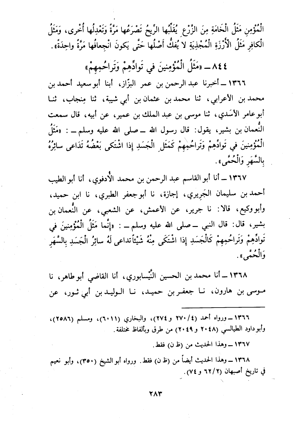 1367 - أنا أَبُو الْقَاسِمِ عَبْدُ الرَّحْمَنِ بْنُ مُحَمَّدٍ الْأُدْفُوِيُّ، أنا أَبُو الطَّيِّبِ أَحْمَدُ بْنُ سُلَيْمَانَ الْجُرَيْرِيُّ إِجَازَةً، نا أَبُو جَعْفَرٍ الطَّبَرِيُّ، نا ابْنُ حُمَيْدٍ، وَأَبُو وَكِيعٍ، قَالَا: نا جَرِيرٌ، عَنِ الْأَعْمَشِ، عَنِ الشَّعْبِيِّ، عَنِ النُّعْمَانِ بْنِ بَشِيرٍ، قَالَ: قَالَ النَّبِيُّ صَلَّى اللهُ عَلَيْهِ وَسَلَّمَ: «إِنَّمَا §مَثَلُ الْمُؤْمِنِينَ فِي تَوَادِّهِمْ وَتَرَاحُمِهِمْ كَالْجَسَدِ إِذَا اشْتَكَى مِنْهُ شَيْئًا تَدَاعَى لَهُ سَائِرُ الْجَسَدِ بِالسَّهَرِ وَالْحُمَّى»