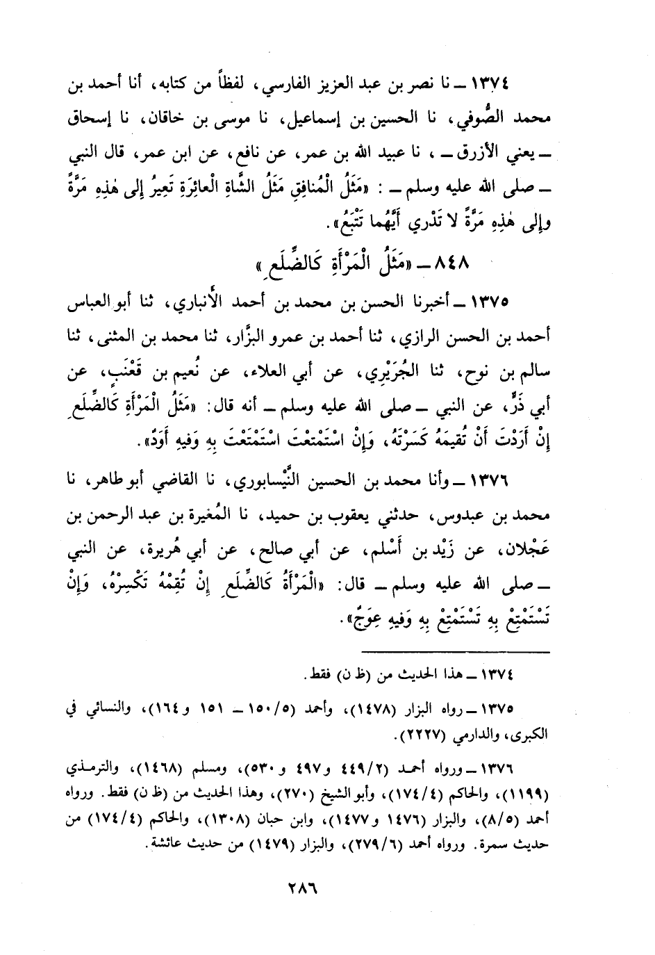 1376 - وأنا مُحَمَّدُ بْنُ الْحُسَيْنِ النَّيْسَابُورِيُّ، نا الْقَاضِي أَبُو طَاهِرٍ، نا مُحَمَّدُ بْنُ عَبْدُوسٍ، حَدَّثَنِي يَعْقُوبُ بْنُ حُمَيْدٍ، نا الْمُغِيرَةُ بْنُ عَبْدِ الرَّحْمَنِ بْنِ عَجْلَانَ، عَنْ زَيْدِ بْنِ أَسْلَمَ، عَنْ أَبِي صَالِحٍ، عَنْ أَبِي هُرَيْرَةَ، عَنِ النَّبِيِّ صَلَّى اللهُ عَلَيْهِ وَسَلَّمَ قَالَ: «§الْمَرْأَةُ كَالضِّلَعِ إِنْ تُقِمْهُ تَكْسِرْهُ، وَإِنْ تَسْتَمْتِعْ بِهِ تَسْتَمْتِعْ بِهِ وَفِيهِ عِوَجٌ»