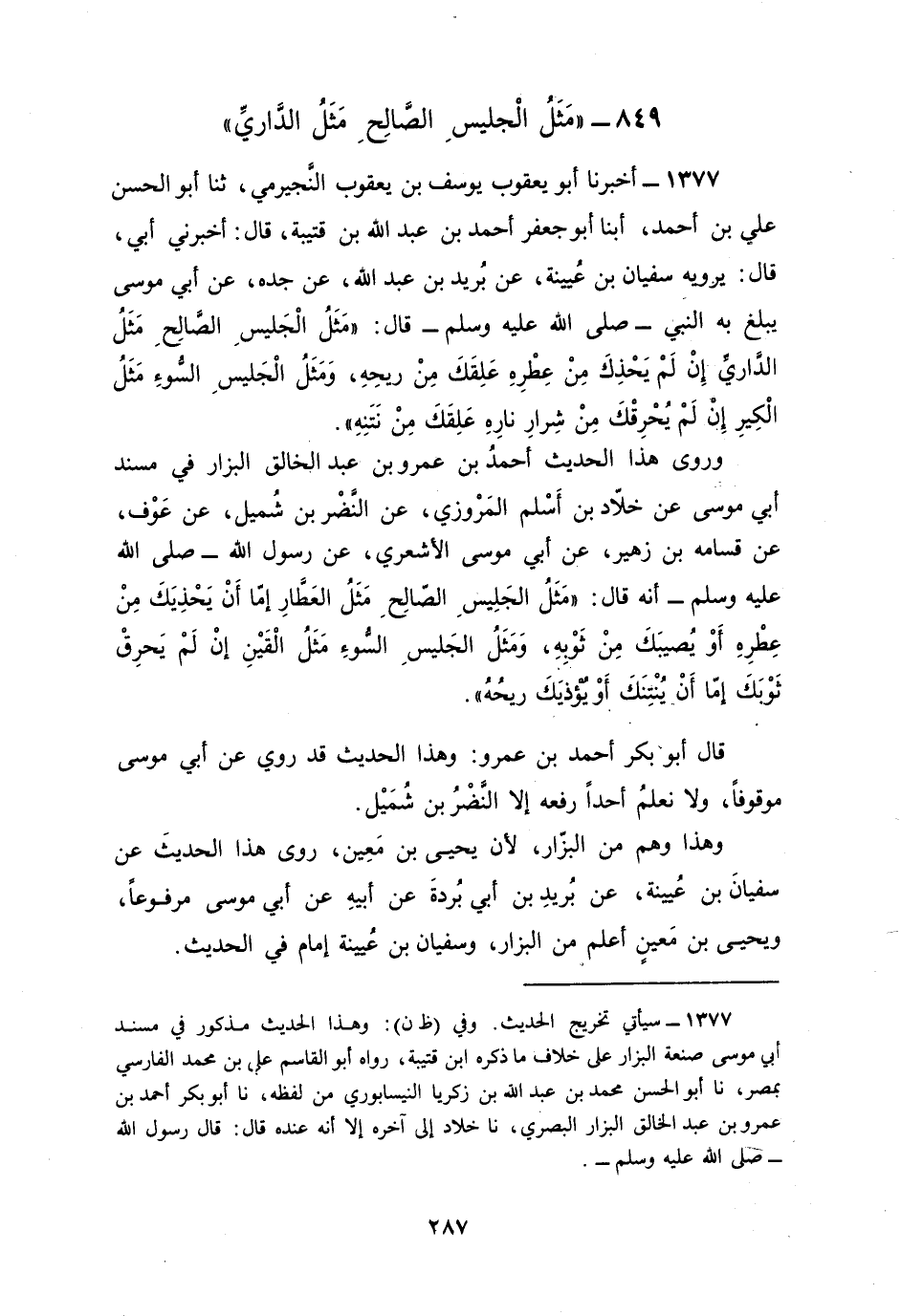 1377 - أَخْبَرَنَا أَبُو يَعْقُوبَ يُوسُفُ بْنُ يَعْقُوبَ النَّجِيرَمِيُّ، ثنا أَبُو الْحَسَنِ عَلِيُّ بْنُ أَحْمَدَ، أبنا أَبُو جَعْفَرٍ أَحْمَدُ بْنُ عَبْدِ اللَّهِ بْنِ قُتَيْبَةَ قَالَ: أَخْبَرَنِي أَبِي قَالَ: يَرْوِيهِ سُفْيَانُ بْنُ عُيَيْنَةَ عَنْ بُرَيْدِ بْنِ عَبْدِ اللَّهِ، عَنْ جَدِّهِ، عَنْ أَبِي مُوسَى، يَبْلُغُ بِهِ النَّبِيَّ صَلَّى اللهُ عَلَيْهِ وَسَلَّمَ قَالَ: §«مَثَلُ الْجَلِيسِ الصَّالِحِ مَثَلُ الدَّارِيِّ إِنْ لَمْ يُحْذِكَ مِنْ عِطْرِهِ عَلَقَكَ مِنْ رِيحِهِ، وَمَثَلُ الْجَلِيسِ السُّوءِ مَثَلُ الْكِيرِ إِنْ لَمْ يُحْرِقْكَ مِنْ شِرَارِ نَارِهِ عَلَقَكَ مِنْ نَتَنِهِ» وَرَوَى هَذَا الْحَدِيثَ أَحْمَدُ بْنُ عَمْرِو بْنِ عَبْدِ الْخَالِقِ الْبَزَّارُ فِي مُسْنَدِ أَبِي مُوسَى، عَنْ خَلَّادِ بْنِ أَسْلَمَ الْمَرْوَزِيِّ، عَنِ النَّضْرِ بْنِ شُمَيْلِ، عَنْ عَوْفٍ، عَنْ قَسَامَةَ بْنِ زُهَيْرٍ، عَنْ أَبِي مُوسَى الْأَشْعَرِيِّ، عَنْ رَسُولِ اللَّهِ صَلَّى اللهُ عَلَيْهِ وَسَلَّمَ أَنَّهُ قَالَ: «مَثَلُ الْجَلِيسِ الصَّالِحِ مَثَلُ الْعَطَّارِ إِمَّا أَنْ يُحْذِيَكَ مِنْ عِطْرِهِ أَوْ يُصِيبَكَ مِنْ ثَوْبِهِ، وَمَثَلُ الْجَلِيسِ السُّوءِ مَثَلُ الْقَيْنِ إِنْ لَمْ يُحْرِقْ ثَوْبَكَ إِمَّا أَنْ يُنْتِنَكَ أَوْ يُؤْذِيَكَ رِيحُهُ» ، قَالَ أَبُو بَكْرٍ أَحْمَدُ بْنُ عَمْرٍو: وَهَذَا الْحَدِيثُ قَدْ رُوِيَ عَنْ أَبِي مُوسَى مَوْقُوفًا، وَلَا نَعْلَمُ أَحَدًا رَفَعَهُ إِلَّا النَّضْرَ بْنَ شُمَيْلٍ، وَهَذَا وَهْمٌ مِنَ الْبَزَّارِ لِأَنَّ يَحْيَى بْنَ مَعِينٍ رَوَى هَذَا الْحَدِيثَ عَنْ سُفْيَانَ بْنِ عُيَيْنَةَ، عَنْ بُرَيْدِ بْنِ أَبِي بُرْدَةَ عَنْ أَبِيهِ عَنْ أَبِي مُوسَى مَرْفُوعًا، وَيَحْيَى بْنُ مَعِينٍ أَعْلَمُ مِنَ الْبَزَّارِ، وَسُفْيَانُ بْنُ عُيَيْنَةَ إِمَامٌ فِي الْحَدِيثِ
