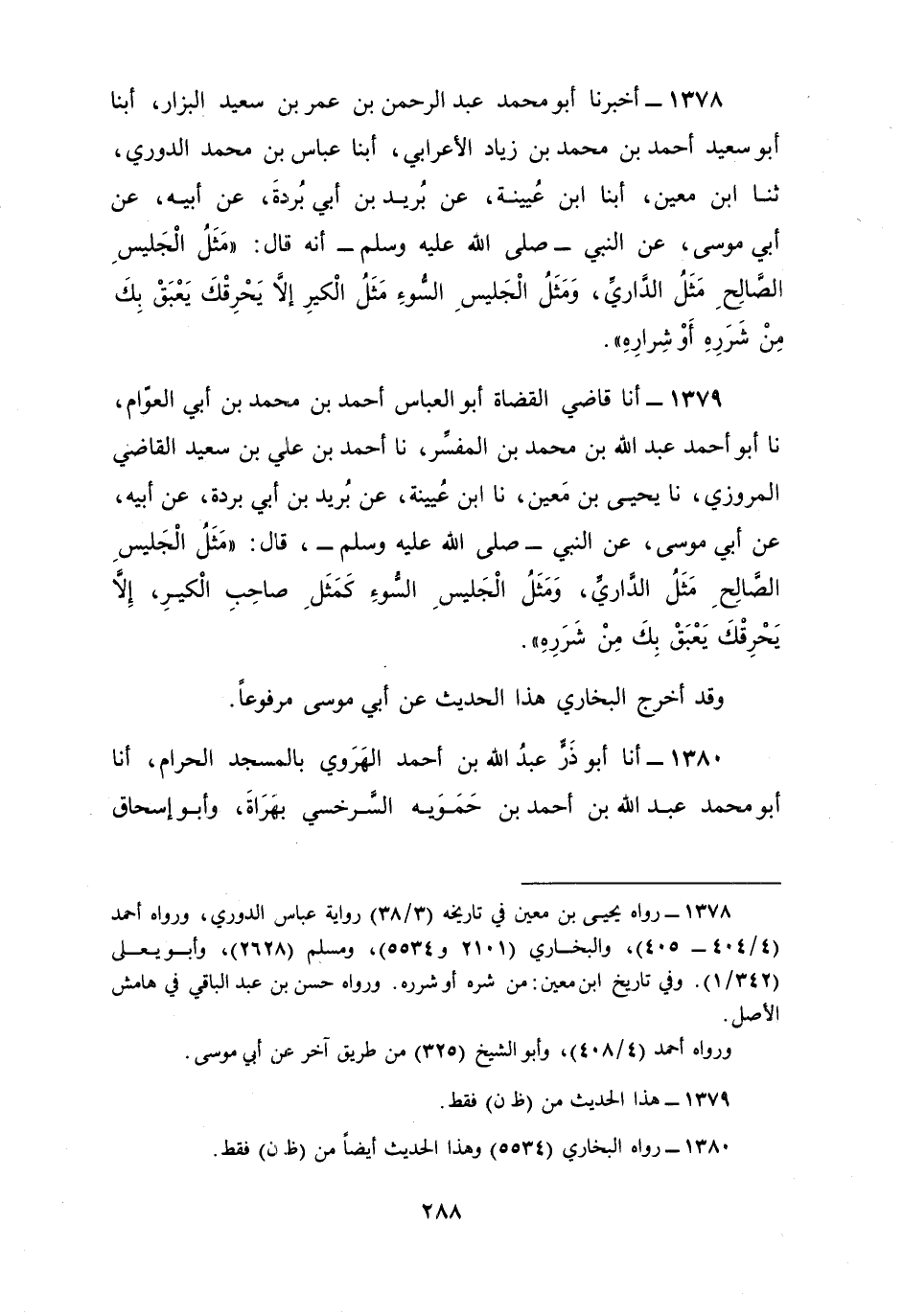 1380 - أنا أَبُو ذَرٍّ عَبْدُ اللَّهِ بْنُ أَحْمَدَ الْهَرَوِيُّ، بِالْمَسْجِدِ الْحَرَامِ، أنا أَبُو مُحَمَّدٍ عَبْدُ اللَّهِ بْنُ أَحْمَدَ بْنِ حَمُّويَهِ السَّرَخْسِيُّ، بِهَرَاةَ وَأَبُو إِسْحَاقَ إِبْرَاهِيمُ بْنُ أَحْمَدَ الْمُسْتَمْلِي بِبَلْخٍ، وَأَبُو الْهَيْثَمِ مُحَمَّدُ بْنُ الْمَكِّيِّ الْكَشْمَيْهَنِيُّ بِهَا قَالُوا: أنا مُحَمَّدُ بْنُ يُوسُفَ الْفَرَبْرِيُّ، أنا عَبْدُ اللَّهِ مُحَمَّدُ بْنُ إِسْمَاعِيلَ الْبُخَارِيُّ، نا مُحَمَّدُ بْنُ الْعَلَاءِ، نا أَبُو أُسَامَةَ، عَنْ بُرَيْدٍ، عَنْ أَبِي بُرْدَةَ، عَنْ أَبِي مُوسَى، عَنِ النَّبِيِّ صَلَّى اللهُ عَلَيْهِ وَسَلَّمَ قَالَ: §«مِثْلُ الْجَلِيسِ الصَّالِحِ وَالسَّوْءِ كَحَامِلِ الْمِسْكِ وَنَافِخِ الْكِيرِ، فَحَامِلُ الْمِسْكِ إِمَّا أَنْ يُحْذِيَكَ وَإِمَّا أَنْ تَبْتَاعَ مِنْهُ وَإِمَّا أَنْ تَجِدَ مِنْهُ رِيحًا طَيْبَةً، وَنَافِخُ الْكِيرِ إِمَّا أَنْ يُحْرِقَ ثِيَابَكَ وَإِمَّا أَنْ تَجِدَ مِنْهُ رِيحًا خَبِيثَةً»