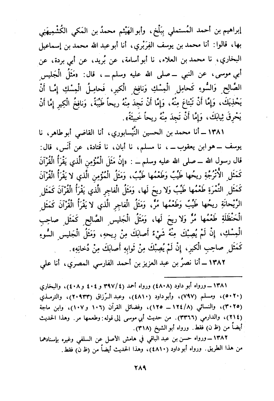 1381 - أنا مُحَمَّدُ بْنُ الْحُسَيْنِ النَّيْسَابُورِيُّ، أنا الْقَاضِي أَبُو طَاهِرٍ، نا يُوسُفُ هُوَ ابْنُ يَعْقُوبَ، نا مُسْلِمٌ، نا أَبَانُ، نا قَتَادَةُ، عَنْ أَنَسٍ، قَالَ: قَالَ رَسُولُ اللَّهِ صَلَّى اللهُ عَلَيْهِ وَسَلَّمَ: «إِنَّ §مَثَلَ الْمُؤْمِنِ الَّذِي يَقْرَأُ الْقُرْآنَ كَمَثَلِ الْأُتْرُجَّةِ رِيحُهَا طَيِّبٌ وَطَعْمُهَا طَيِّبٌ، وَمَثَلُ الْمُؤْمِنِ الَّذِي لَا يَقْرَأُ الْقُرْآنَ كَمَثَلِ التَّمْرَةِ طَعْمُهَا طَيِّبٌ وَلَا رِيحَ لَهَا، وَمَثَلُ الْفَاجِرِ الَّذِي يَقْرَأُ الْقُرْآنَ كَمَثَلِ الرَّيْحَانَةِ رِيحُهَا طَيِّبٌ وَطَعْمُهَا مُرٌّ، وَمَثَلُ الْفَاجِرِ الَّذِي لَا يَقْرَأُ الْقُرْآنَ كَمَثَلِ الْحَنْظَلَةِ طَعْمُهَا مُرٌّ وَلَا رِيحَ لَهَا، وَمَثَلُ الْجَلِيسِ الصَّالِحِ كَمَثَلِ صَاحِبِ الْمِسْكِ إِنْ لَمْ يُصِبْكَ مِنْهُ شَيْءٌ أَصَابَكَ مِنْ رِيحِهِ، وَمَثَلُ الْجَلِيسِ السُّوءِ كَمَثَلِ صَاحِبِ الْكِيرِ إِنْ لَمْ يُصِبْكَ مِنْ ثَوَابِهِ أَصَابَكَ مِنْ دُخَانِهِ»