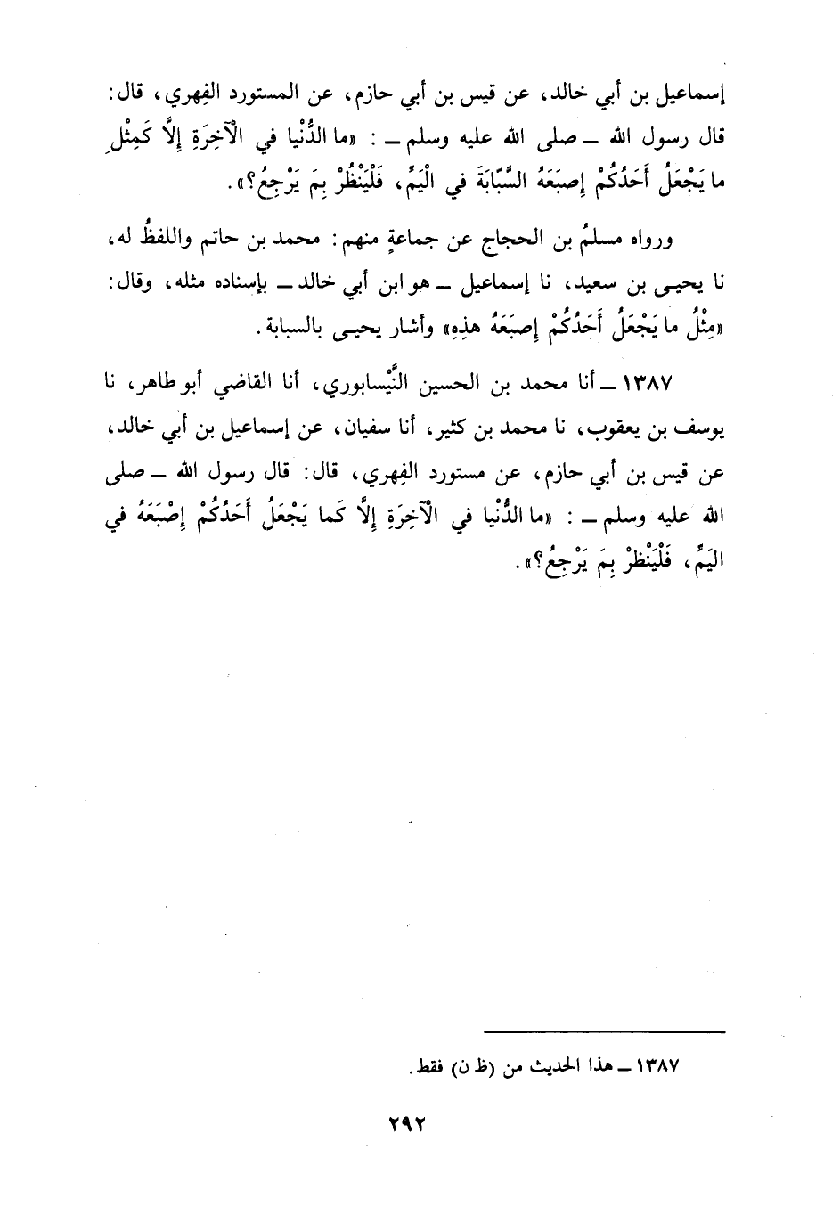 1387 - أنا مُحَمَّدُ بْنُ الْحُسَيْنِ النَّيْسَابُورِيُّ، أنا الْقَاضِي أَبُو طَاهِرٍ، نا يُوسُفُ بْنُ يَعْقُوبَ، نا مُحَمَّدُ بْنُ كَثِيرٍ، أنا سُفْيَانُ، عَنْ إِسْمَاعِيلَ بْنِ أَبِي خَالِدٍ، عَنْ قَيْسِ بْنِ أَبِي حَازِمٍ، عَنْ مُسْتَوْرِدٍ الْفِهْرِيِّ، قَالَ: قَالَ رَسُولُ اللَّهِ صَلَّى اللهُ عَلَيْهِ وَسَلَّمَ: §«مَا الدُّنْيَا فِي الْآخِرَةِ إِلَّا كَمَا يَجْعَلُ أَحَدُكُمْ إِصْبَعَهُ فِي الْيَمِّ فَلْيَنْظُرْ بِمَ يَرْجِعُ»