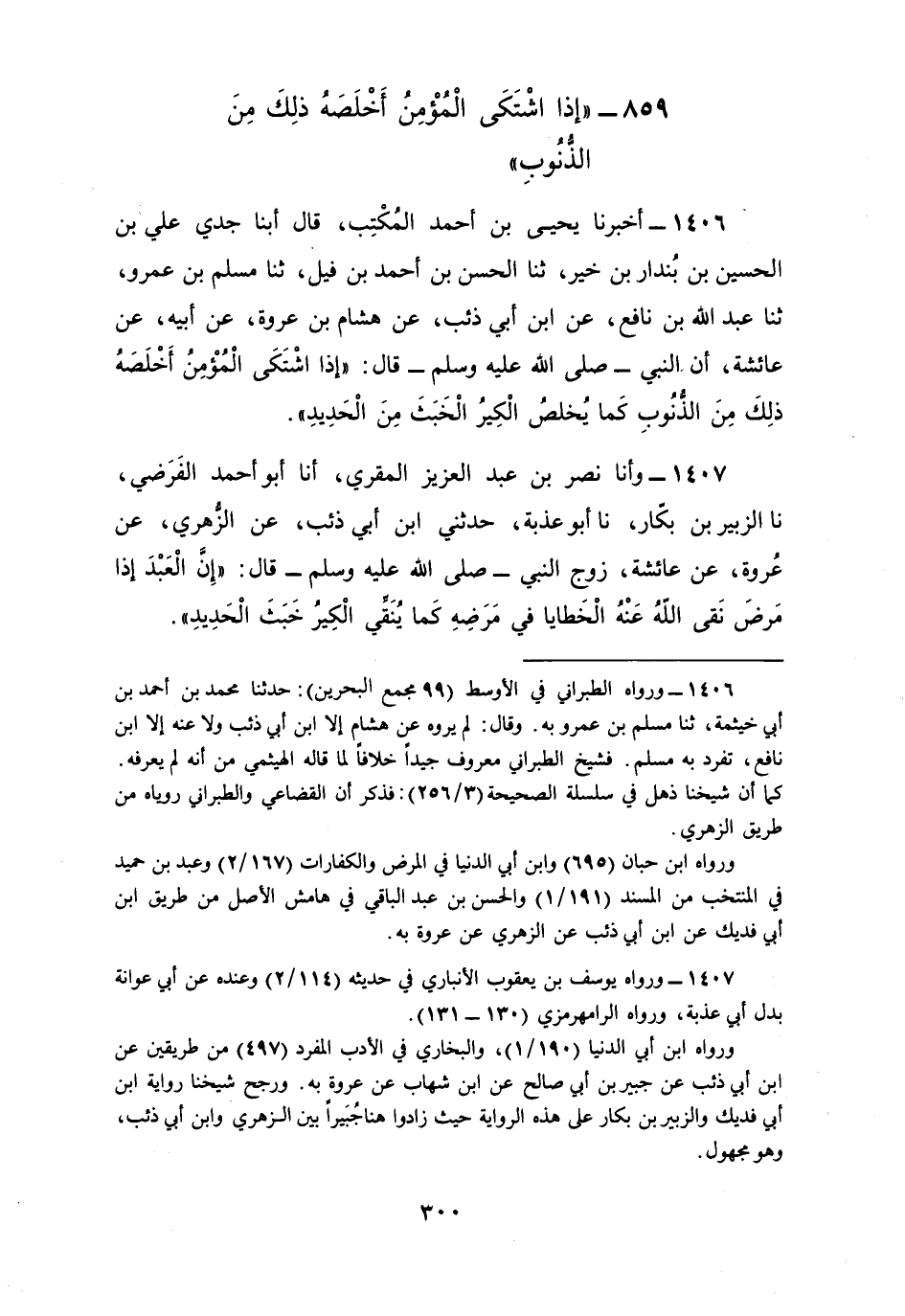 1407 - وأنا نَصْرُ بْنُ عَبْدِ الْعَزِيزِ الْمُقْرِئُ، أنا أَبُو أَحْمَدَ الْفَرْضِيُّ، نا الزُّبَيْرُ بْنُ بَكَّارٍ، نا أَبُو عَذْبَةَ، حَدَّثَنِي ابْنُ أَبِي ذِئْبٍ، عَنِ الزُّهْرِيِّ، عَنْ عُرْوَةَ، عَنْ عَائِشَةَ، زَوْجِ النَّبِيِّ صَلَّى اللهُ عَلَيْهِ وَسَلَّمَ قَالَ: «إِنَّ الْعَبْدَ §إِذَا مَرِضَ نَقَّى اللَّهُ عَنْهُ الْخَطَايَا فِي مَرَضِهِ كَمَا يُنَقِّي الْكِيرُ خَبَثَ الْحَدِيدِ»