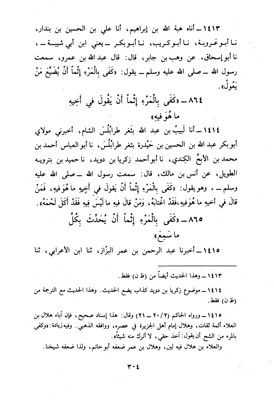 1414 - أنا لَبِيبُ بْنُ عَبْدِ اللَّهِ، بِثَغْرِ طَرَابُلْسِ الشَّامِ، أَخْبَرَنِي مَوْلَايَ أَبُو بَكْرٍ عَبْدُ اللَّهِ بْنُ الْحُسَيْنِ بْنِ حَيْدَرَةَ، بِثَغْرِ طَرَابُلْسَ، نا أَبُو الْعَبَّاسِ أَحْمَدُ بْنُ مُحَمَّدِ بْنِ الْأَبَحِّ الْكِنْدِيُّ، نا أَبُو أَحْمَدَ زَكَرِيَّا بْنُ دُوَيْدٍ، نا حُمَيْدُ بْنُ بَتْرَوَيْهِ الطَّوِيلُ، عَنْ أَنَسِ بْنِ مَالِكٍ، قَالَ: سَمِعْتُ رَسُولَ اللَّهِ صَلَّى اللهُ عَلَيْهِ وَسَلَّمَ وَهُوَ يَقُولُ: §«كَفَى بِالْمَرْءِ إِثْمًا أَنْ يَقُولَ فِي أَخِيهِ مَا هُوَ فِيهِ، فَمَنْ قَالَ فِي أَخِيهِ مَا هُوَ فِيهِ فَقَدِ اغْتَابَهُ، وَمَنْ قَالَ فِيهِ مَا لَيْسَ فِيهِ فَقَدْ أَكَلَ لَحْمَهُ»