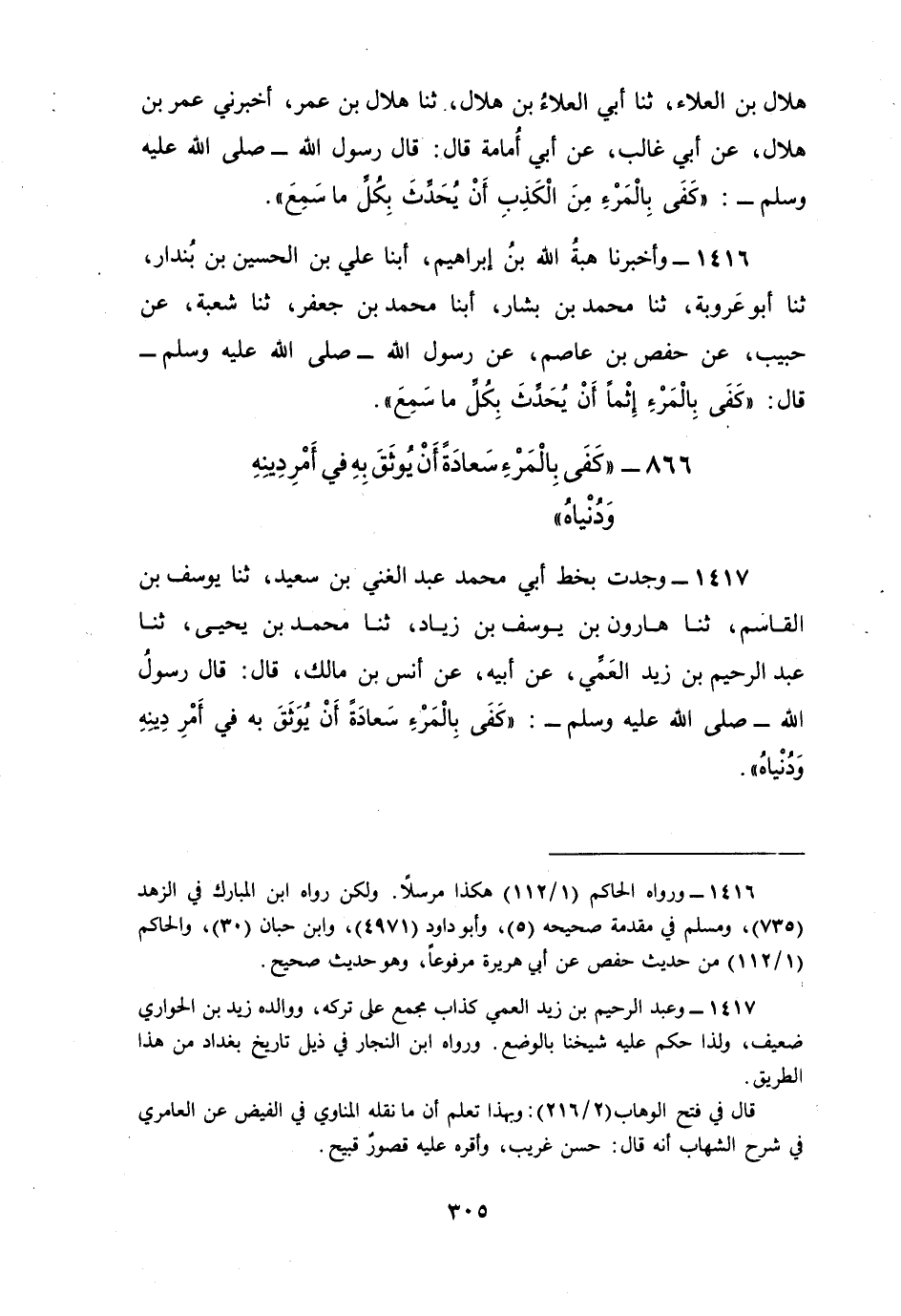1416 - وَأَخْبَرَنَا هِبَةُ اللَّهِ بْنُ إِبْرَاهِيمَ، أبنا عَلِيُّ بْنُ الْحُسَيْنِ بْنِ بُنْدَارٍ، ثنا أَبُو عَرُوبَةَ، ثنا مُحَمَّدُ بْنُ بَشَّارٍ، أبنا مُحَمَّدُ بْنُ جَعْفَرٍ، ثنا شُعْبَةُ، عَنْ خَبِيبٍ، عَنْ حَفْصِ بْنِ عَاصِمٍ، عَنْ رَسُولِ اللَّهِ صَلَّى اللهُ عَلَيْهِ وَسَلَّمَ قَالَ: §«كَفَى بِالْمَرْءِ إِثْمًا أَنْ يُحَدِّثَ بِكُلِّ مَا سَمِعَ»