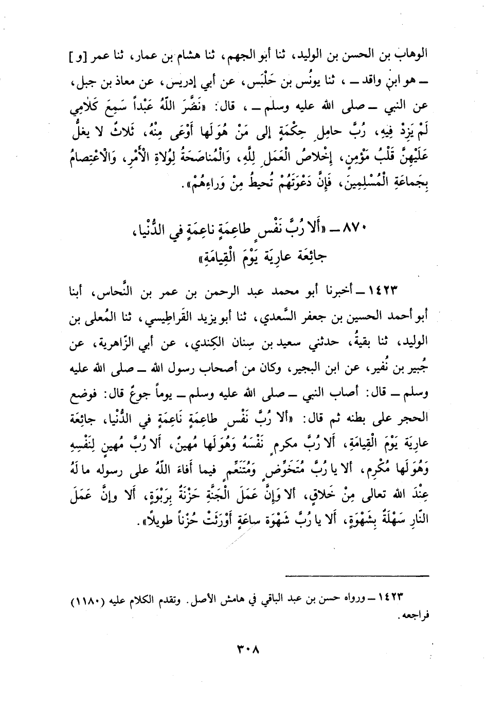 1423 - أَخْبَرَنَا أَبُو مُحَمَّدٍ عَبْدُ الرَّحْمَنِ بْنُ عُمَرَ بْنِ النَّحَّاسِ، أبنا أَبُو أَحْمَدَ الْحُسَيْنُ بْنُ جَعْفَرَ السَّعْدِيُّ، ثنا أَبُو يَزِيدَ الْقَرَاطِيسِيُّ، ثنا الْمُعَلَّى بْنُ الْوَلِيدِ، ثنا بَقِيَّةُ، حَدَّثَنِي سَعِيدُ بْنُ سِنَانٍ الْكِنْدِيُّ، عَنْ أَبِي الزَّاهِرِيَّةِ، عَنْ جُبَيْرِ بْنِ نُفَيْرٍ، عَنِ ابْنِ الْبُجَيْرِ، وَكَانَ مِنْ أَصْحَابِ رَسُولِ اللَّهِ صَلَّى اللهُ عَلَيْهِ وَسَلَّمَ، قَالَ: أَصَابَ النَّبِيَّ صَلَّى اللهُ عَلَيْهِ وَسَلَّمَ يَوْمًا جُوعٌ، قَالَ فَوَضَعَ الْحَجَرَ عَلَى بَطْنِهِ، ثُمَّ قَالَ: «أَلَا وَإِنَّ §رُبَّ نَفْسٍ طَاعِمَةٍ نَاعِمَةٍ فِي الدُّنْيَا جَائِعَةٍ عَارِيَةٍ يَوْمَ الْقِيَامَةِ، أَلَا رُبَّ مُكْرِمٍ نَفْسَهُ وَهُوَ لَهَا مُهِينٌ، أَلَا رُبَّ مُهِينٌ لِنَفْسِهِ وَهُوَ لَهَا مُكْرِمٌ، أَلَا يَا رُبَّ مُتَخَوِّضٍ وَمُتَنَعِّمٍ فِيمَا أَفَاءَ اللَّهُ عَلَى رَسُولِهِ مَا لَهُ عِنْدَ اللَّهِ تَعَالَى مِنْ خَلَاقٍ، أَلَا وَإِنَّ عَمَلَ الْجَنَّةِ حَزْنَةٌ بِرَبْوَةٍ، أَلَا وَإِنَّ عَمَلَ النَّارِ سَهْلَةٌ بِشَهْوَةٍ، أَلَا يَا رُبَّ شَهْوَةَ سَاعَةٍ أَوْرَثَتْ حُزْنًا طَوِيلًا»