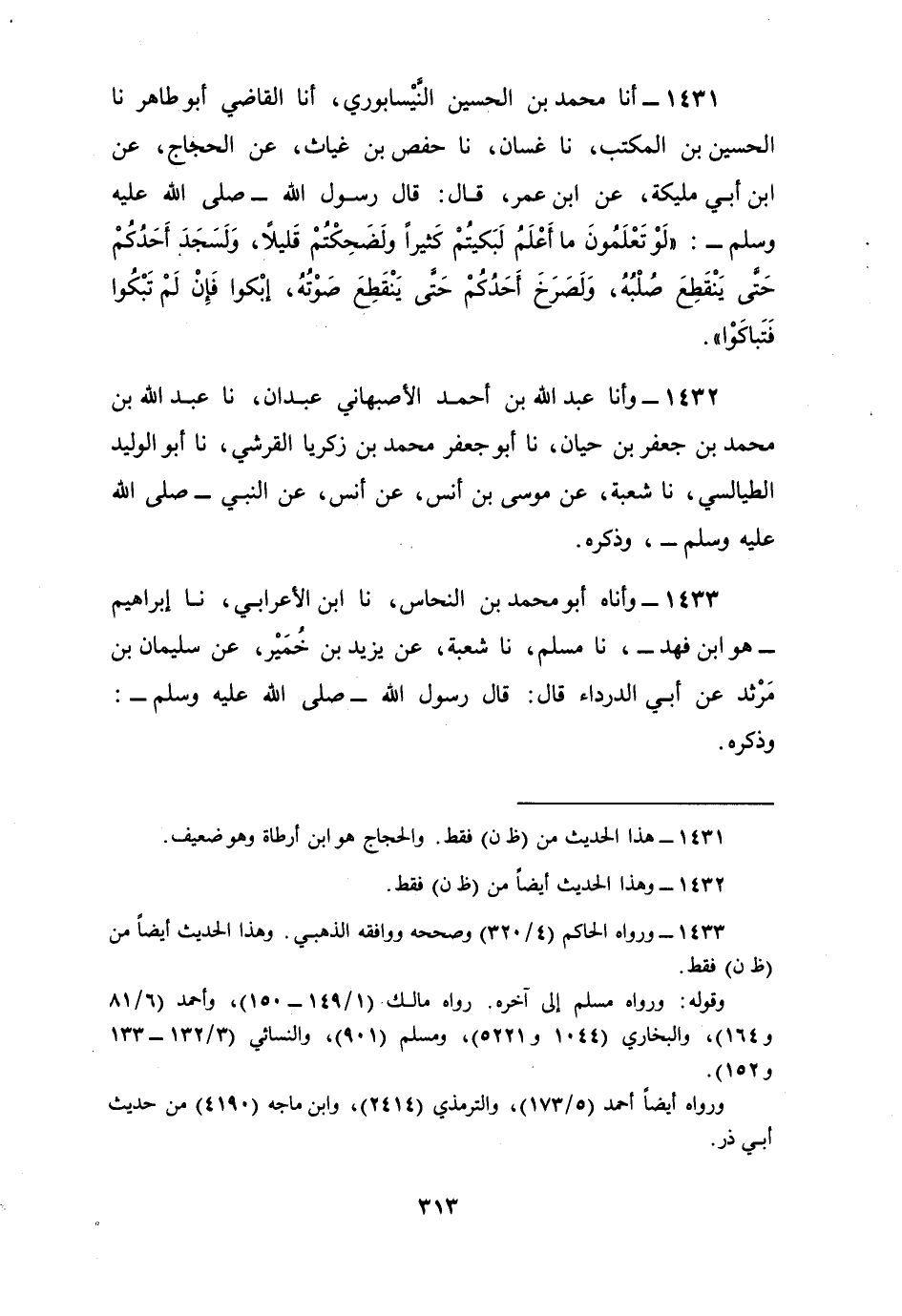 1431 - أنا مُحَمَّدُ بْنُ الْحُسَيْنِ النَّيْسَابُورِيُّ، أنا الْقَاضِي أَبُو طَاهِرٍ، نا الْحُسَيْنُ بْنُ الْمُكْتِبِ، نا غَسَّانُ، نا حَفْصُ بْنُ غِيَاثٍ، عَنِ الْحَجَّاجِ، عَنِ ابْنِ أَبِي مُلَيْكَةَ، عَنِ ابْنِ عُمَرَ، قَالَ: قَالَ رَسُولُ اللَّهِ صَلَّى اللهُ عَلَيْهِ وَسَلَّمَ: «§لَوْ تَعْلَمُونَ مَا أَعْلَمُ لَبَكَيْتُمْ كَثِيرًا وَلَضَحِكْتُمْ قَلِيلًا، وَلَسَجَدَ أَحَدُكُمْ حَتَّى يَنْقَطِعَ صُلْبُهُ، وَلَصَرَخَ أَحَدُكُمْ حَتَّى يَنْقَطِعَ صَوْتَهُ، ابْكُوا فَإِنْ لَمْ تَبْكُوا فَتَبَاكَوْا»