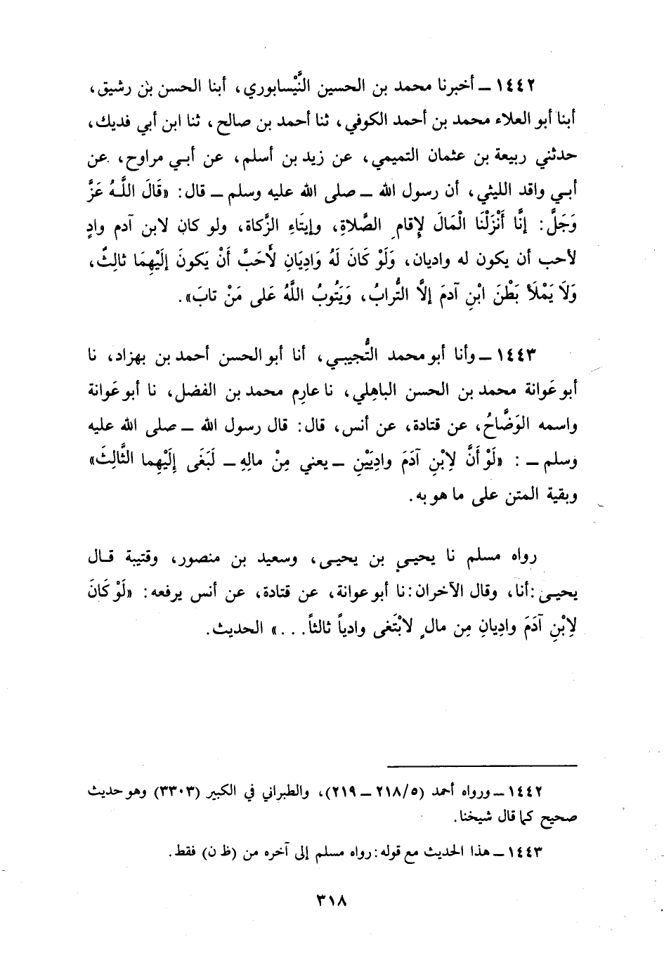 1443 - وأنا أَبُو مُحَمَّدٍ التُّجِيبِيُّ، أنا أَبُو الْحَسَنِ أَحْمَدُ بْنُ بُهْزَادَ نا أَبُو عَوَانَةَ مُحَمَّدُ بْنُ الْحَسَنِ الْبَاهِلِيُّ، نا عَارِمٌ، مُحَمَّدُ بْنُ الْفَضْلِ، نا أَبُو عَوَانَةَ وَاسْمُهُ الْوَضَّاحُ، عَنْ قَتَادَةَ، عَنْ أَنَسٍ، قَالَ: قَالَ رَسُولُ اللَّهِ صَلَّى اللهُ عَلَيْهِ وَسَلَّمَ: «لَوْ أَنَّ لِابْنِ آدَمَ وَادِيَيْنِ، يَعْنِي مِنْ مَالِهِ لَبَغَى إِلَيْهِمَا الثَّالِثَ.» وَبَقِيَّةُ الْمَتْنِ عَلَى مَا هُوَ بِهِ، رَوَاهُ مُسْلِمٌ، نَا يَحْيَى بْنُ يَحْيَى وَسَعِيدُ بْنُ مَنْصُورٍ وَقُتَيْبَةُ، قَالَ يَحْيَى: أَنَا، وَقَالَ الْآخَرَانِ: نَا أَبُو عَوَانَةَ، عَنْ قَتَادَةَ عَنْ أَنَسٍ يَرْفَعُهُ: «لَوْ كَانَ لِابْنِ آدَمَ وَادِيَانِ مِنْ مَالٍ لَابْتَغَى وَادِيًا ثَالِثًا» الْحَدِيثَ