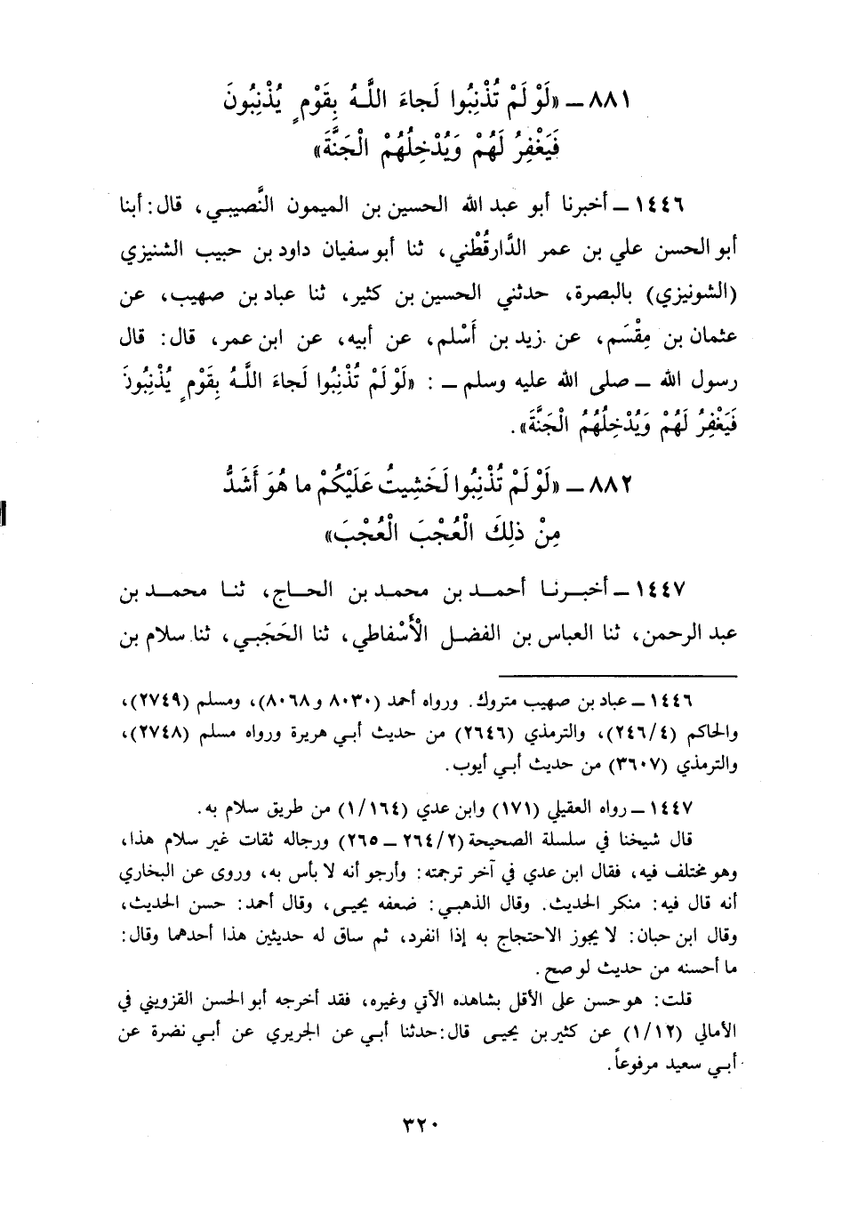 1446 - أَخْبَرَنَا أَبُو عَبْدِ اللَّهِ الْحُسَيْنُ بْنُ الْمَيْمُونِ النَّصِيبِيُّ، قَالَ: أبنا أَبُو الْحَسَنِ عَلِيُّ بْنُ عُمَرَ الدَّارَقُطْنِيُّ، ثنا أَبُو سُفْيَانَ دَاوُدُ بْنُ حَبِيبٍ الشَّنِيزِيُّ بِالْبَصْرَةِ، حَدَّثَنِي الْحُسَيْنُ بْنُ كَثِيرٍ، ثنا عَبَّادُ بْنُ صُهَيْبٍ، عَنْ عُثْمَانَ بْنِ مِقْسَمٍ، عَنْ زَيْدِ بْنِ أَسْلَمَ، عَنْ أَبِيهِ، عَنِ ابْنِ عُمَرَ، قَالَ: قَالَ رَسُولُ اللَّهِ صَلَّى اللهُ عَلَيْهِ وَسَلَّمَ: §«لَوْ لَمْ تُذْنِبُوا لَجَاءَ اللَّهُ بِقَوْمٍ يُذْنِبُونَ فَيَغْفِرُ لَهُمْ وَيُدْخِلُهُمُ الْجَنَّةَ»