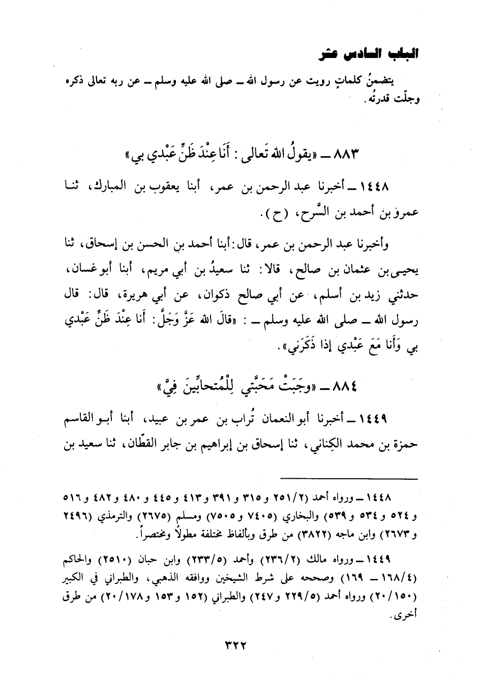 1448 - أَخْبَرَنَا عَبْدُ الرَّحْمَنِ بْنُ عُمَرَ، أبنا يَعْقُوبُ بْنُ الْمُبَارَكِ، ثنا عَمْرُو بْنُ أَحْمَدَ بْنِ السَّرْحِ ح وَأَخْبَرَنَا عَبْدُ الرَّحْمَنِ بْنُ عُمَرَ، قَالَ: أبنا أَحْمَدُ بْنُ الْحَسَنِ بْنِ إِسْحَاقَ، ثنا يَحْيَى بْنُ عُثْمَانَ بْنِ صَالِحٍ، قَالَا: ثنا سَعِيدُ بْنُ أَبِي مَرْيَمَ، أبنا أَبُو غَسَّانَ، حَدَّثَنِي زَيْدُ بْنُ أَسْلَمَ، عَنْ أَبِي صَالِحٍ ذَكْوَانَ، عَنْ أَبِي هُرَيْرَةَ، قَالَ: قَالَ رَسُولُ اللَّهِ صَلَّى اللهُ عَلَيْهِ وَسَلَّمَ: " قَالَ اللَّهُ عَزَّ وَجَلَّ: §أَنَا عِنْدَ ظَنِّ عَبْدِي بِي، وَأَنَا مَعَ عَبْدِي إِذَا ذَكَرَنِي "