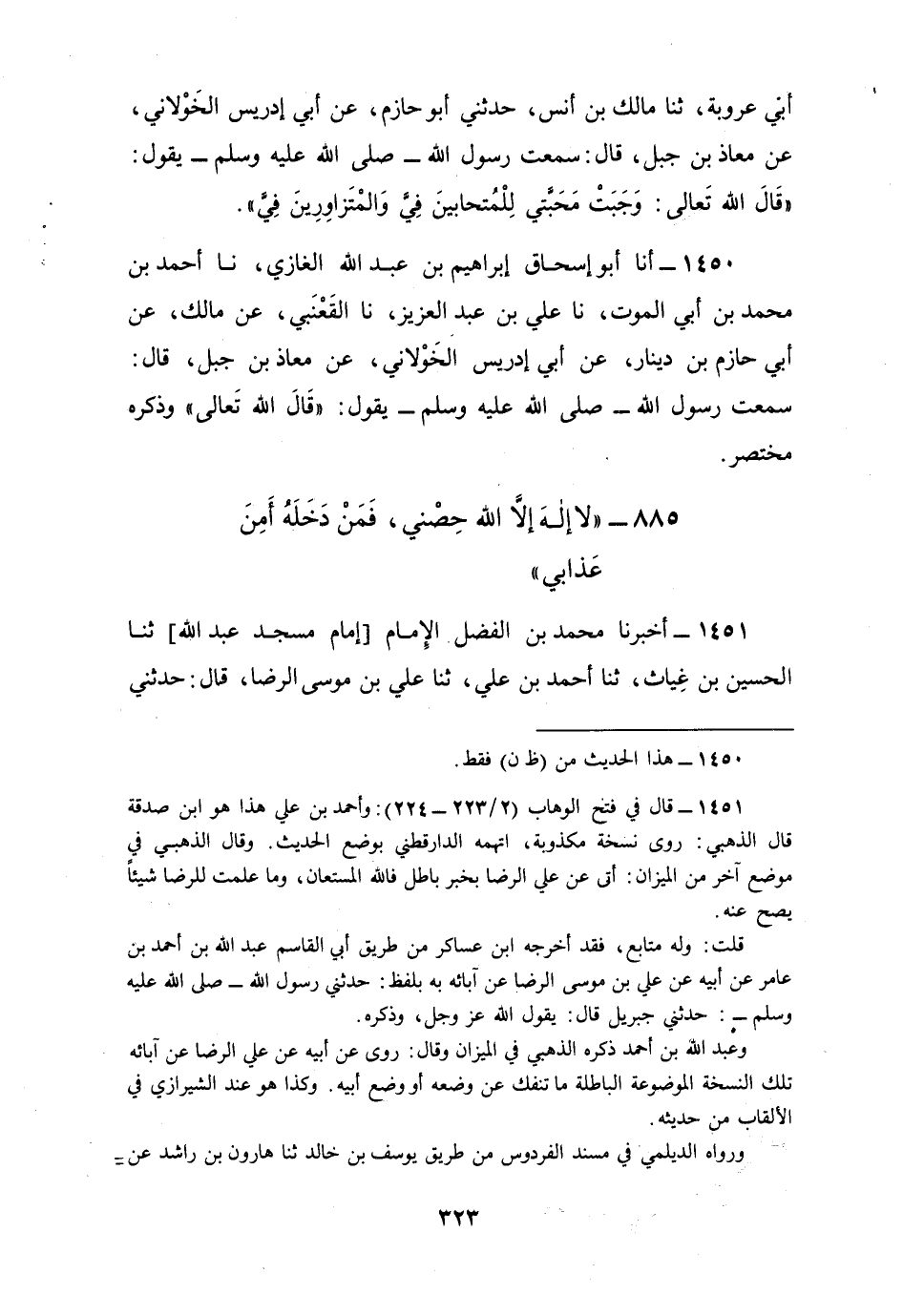 1451 - أَخْبَرَنَا مُحَمَّدُ بْنُ الْفَضْلِ الْإِمَامُ، إِمَامُ مَسْجِدِ عَبْدِ اللَّهِ، ثنا الْحُسَيْنُ بْنُ غِيَاثٍ، ثنا أَحْمَدُ بْنُ عَلِيٍّ، ثنا عَلِيُّ بْنُ مُوسَى الرِّضَا، قَالَ: حَدَّثَنِي أَبِي مُوسَى بْنُ جَعْفَرٍ، حَدَّثَنِي أَبِي جَعْفَرُ بْنُ مُحَمَّدٍ، حَدَّثَنِي أَبِي مُحَمَّدُ بْنُ عَلِيٍّ، حَدَّثَنِي أَبِي عَلِيُّ بْنُ الْحُسَيْنِ، حَدَّثَنِي أَبِي الْحُسَيْنُ بْنُ عَلِيٍّ، حَدَّثَنِي عَلِيُّ بْنُ أَبِي طَالِبٍ رَضِيَ اللَّهُ عَنْهُ قَالَ: قَالَ رَسُولُ اللَّهِ صَلَّى اللهُ عَلَيْهِ وَسَلَّمَ: " يَقُولُ اللَّهُ تَعَالَى: §لَا إِلَهَ إِلَّا اللَّهُ حِصْنِي فَمَنْ دَخَلَهُ أَمِنَ عَذَابِي "