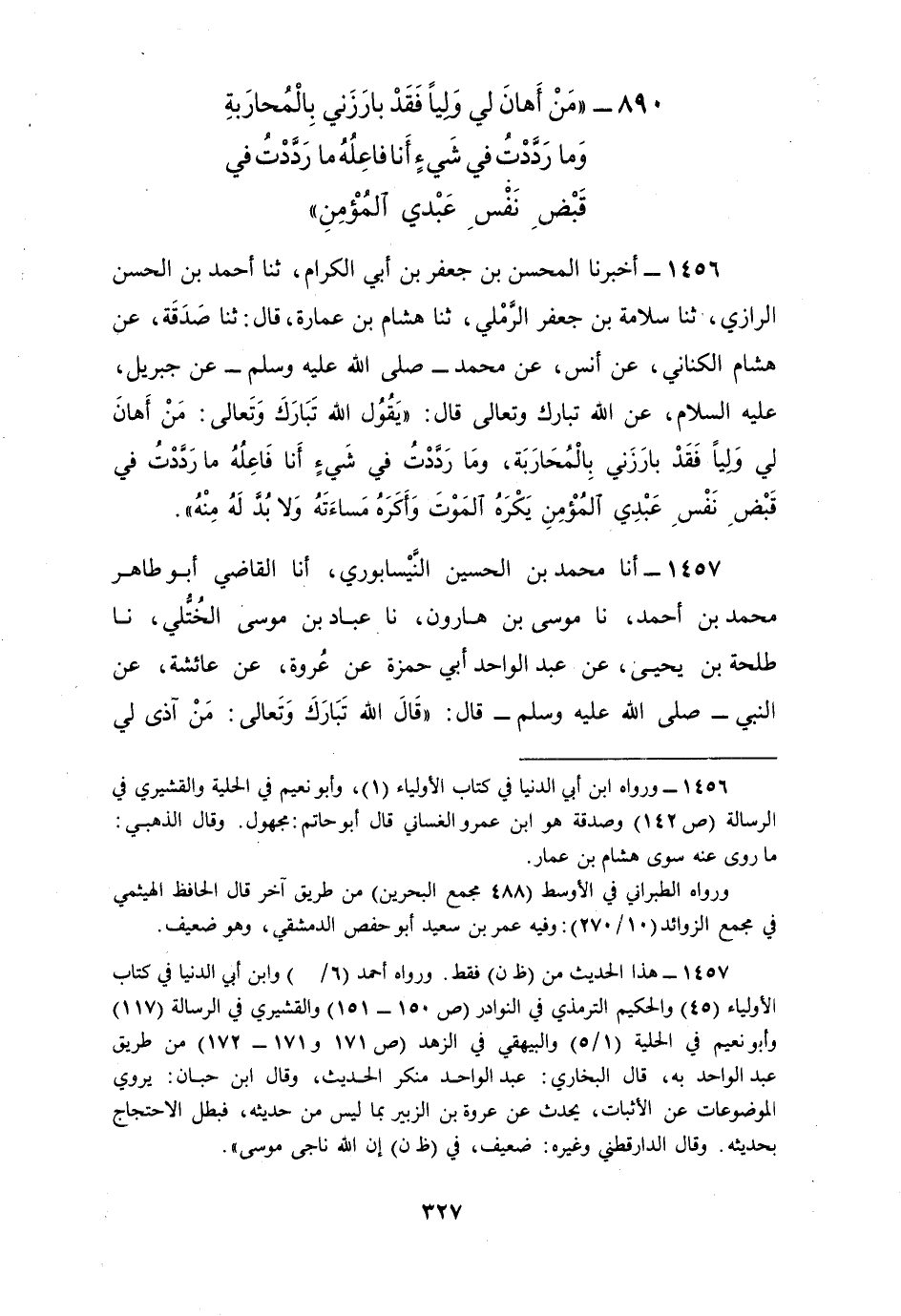 1457 - أنا مُحَمَّدُ بْنُ الْحُسَيْنِ النَّيْسَابُورِيُّ، أنا الْقَاضِي أَبُو طَاهِرٍ، مُحَمَّدُ بْنُ أَحْمَدَ، نا مُوسَى بْنُ هَارُونَ، نا عَبَّادُ بْنُ مُوسَى الْخُتُلِّيُّ، نا طَلْحَةُ بْنُ يَحْيَى، عَنْ عَبْدِ الْوَاحِدِ أَبِي حَمْزَةَ، عَنْ عُرْوَةَ، عَنْ عَائِشَةَ، عَنِ النَّبِيِّ صَلَّى اللهُ عَلَيْهِ وَسَلَّمَ قَالَ: " قَالَ اللَّهُ تَبَارَكَ وَتَعَالَى: §مَنْ آذَى لِي وَلِيًّا فَقَدِ اسْتَحَلَّ مَحَارِمِي، وَمَا تَقَرَّبَ إِلَيَّ عَبْدٌ بِمِثْلِ أَدَاءِ فَرَائِضَ، وَإِنَّ عَبْدِي لَيَتَقَرَّبُ إِلَيَّ بِالنَّوَافِلِ حَتَّى أُحِبَّهُ، إِنْ دَعَانِي أَجَبْتُهُ، وَإِنْ سَأَلَنِي أَعْطَيْتُهُ، وَمَا تَرَدَّدْتُ عَنْ شَيْءٍ أَنَا فَاعِلُهُ تَرَدُّدِي عَنْ مَوْتِهِ، لِأَنَّهُ يَكْرَهُ الْمَوْتَ وَأَكْرَهُ مَسَاءَتَهُ "