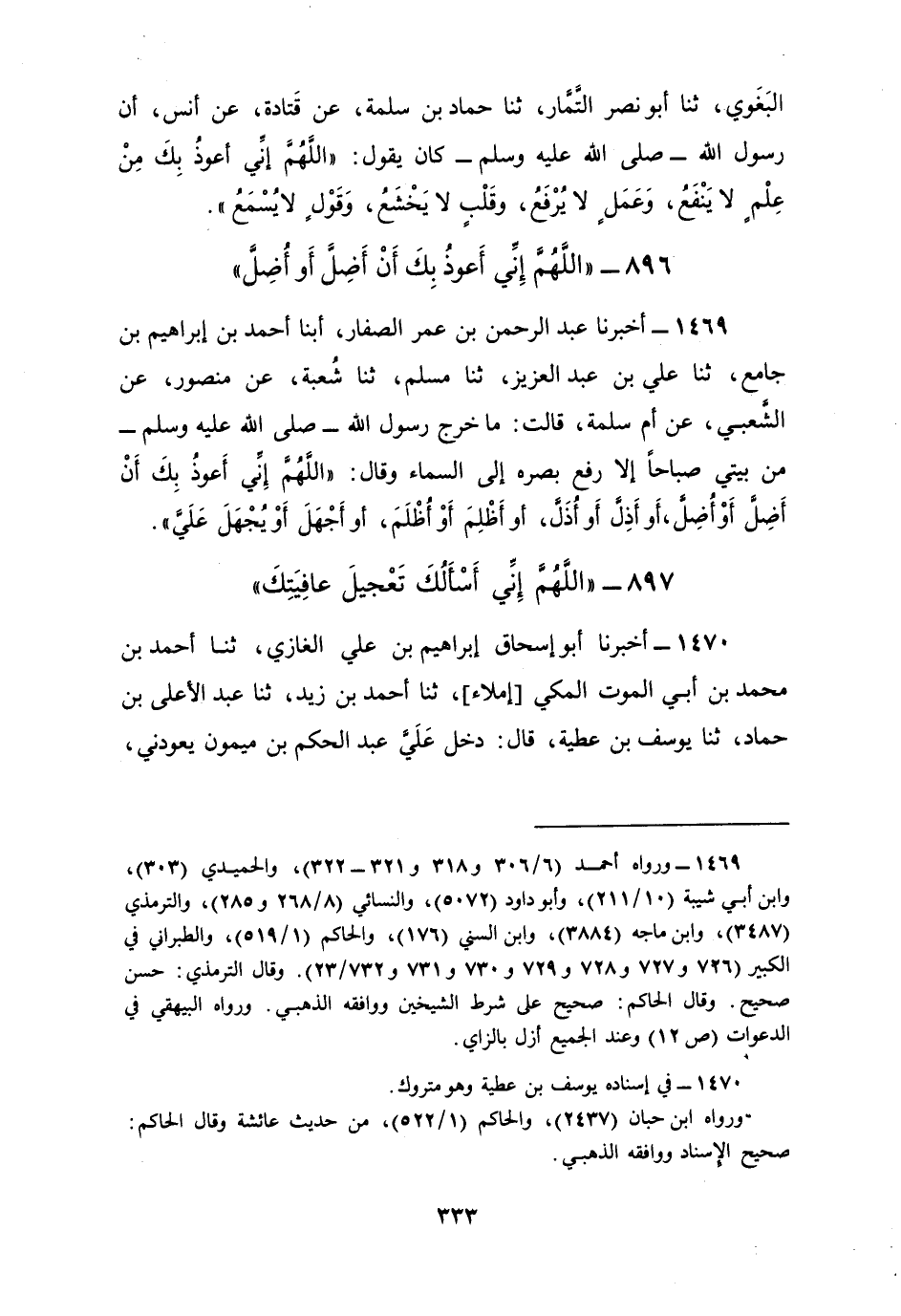 1469 - أَخْبَرَنَا عَبْدُ الرَّحْمَنِ بْنُ عُمَرَ الصَّفَّارُ، أبنا أَحْمَدُ بْنُ إِبْرَاهِيمَ بْنِ جَامِعٍ، ثنا عَلِيُّ بْنُ عَبْدِ الْعَزِيزِ، ثنا مُسْلِمٌ، ثنا شُعْبَةُ، عَنْ مَنْصُورٍ، عَنِ الشَّعْبِيِّ، عَنْ أُمِّ سَلَمَةَ، قَالَتْ: مَا خَرَجَ رَسُولُ اللَّهِ صَلَّى اللهُ عَلَيْهِ وَسَلَّمَ مِنْ بَيْتِي صَبَاحًا إِلَّا رَفَعَ بَصَرَهُ إِلَى السَّمَاءِ وَقَالَ: «اللَّهُمَّ إِنِّي أَعُوذُ بِكَ §أَنْ أَضِلَّ أَوْ أُضَلَّ، أَوْ أَذِلَّ أَوْ أُذَلَّ، أَوْ أَظْلِمَ أَوْ أُظْلَمَ، أَوْ أَجْهَلَ أَوْ يُجْهَلَ عَلَيَّ»