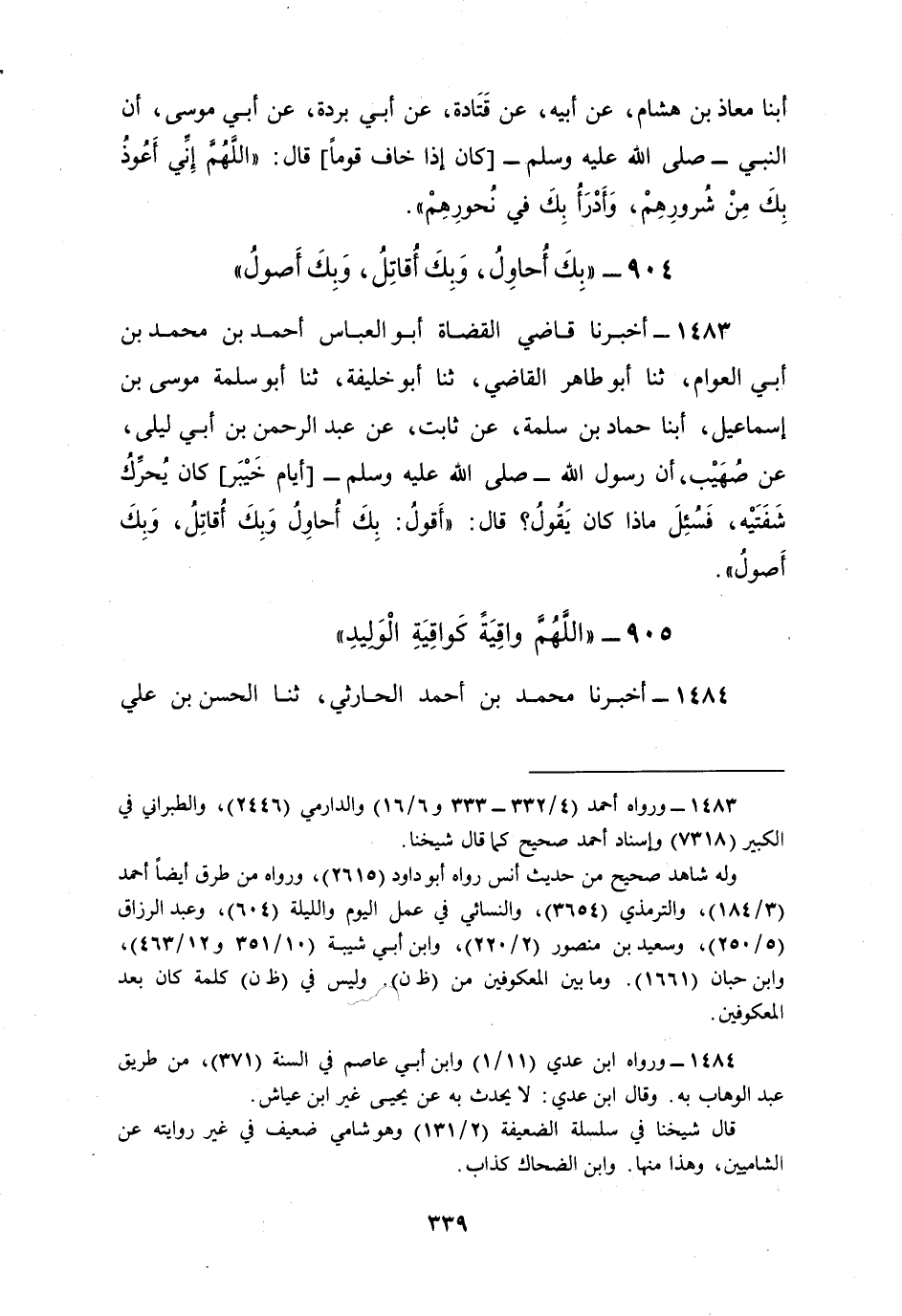 1483 - أَخْبَرَنَا قَاضِي الْقُضَاةِ أَبُو الْعَبَّاسِ أَحْمَدُ بْنُ مُحَمَّدِ بْنِ أَبِي الْعَوَّامِ، ثنا أَبُو طَاهِرٍ الْقَاضِي، ثنا أَبُو خَلِيفَةَ، ثنا أَبُو سَلَمَةَ مُوسَى بْنُ إِسْمَاعِيلَ، أبنا حَمَّادُ بْنُ سَلَمَةَ، عَنْ ثَابِتٍ، عَنْ عَبْدِ الرَّحْمَنِ بْنِ أَبِي لَيْلَى، عَنْ صُهَيْبٍ، أَنَّ رَسُولَ اللَّهِ صَلَّى اللهُ عَلَيْهِ وَسَلَّمَ أَيَّامَ خَيْبَرَ كَانَ يُحَرِّكُ شَفَتَيْهِ، فَسُئِلَ مَاذَا كَانَ يَقُولُ؟ قَالَ: «أَقُولُ §بِكَ أُحَاوِلُ وَبِكَ أُقَاتِلُ وَبِكَ أَصُولُ»
