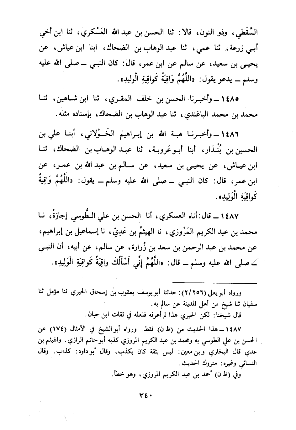 1486 - وَأَخْبَرَنَا هِبَةُ اللَّهِ بْنُ إِبْرَاهِيمَ الْخَوْلَانِيُّ، أبنا عَلِيُّ بْنُ الْحُسَيْنِ بْنِ بُنْدَارٍ، أبنا أَبُو عَرُوبَةَ، ثنا عَبْدُ الْوَهَّابِ بْنُ الضَّحَّاكِ، ثنا ابْنُ عَيَّاشٍ، عَنْ يَحْيَى بْنِ سَعِيدٍ، عَنْ سَالِمِ بْنِ عَبْدِ اللَّهِ بْنِ عُمَرَ، عَنِ ابْنِ عُمَرَ، قَالَ: كَانَ النَّبِيُّ صَلَّى اللهُ عَلَيْهِ وَسَلَّمَ يَقُولُ: «اللَّهُمَّ §وَاقِيَةً كَوَاقِيَةِ الْوَلِيدِ»