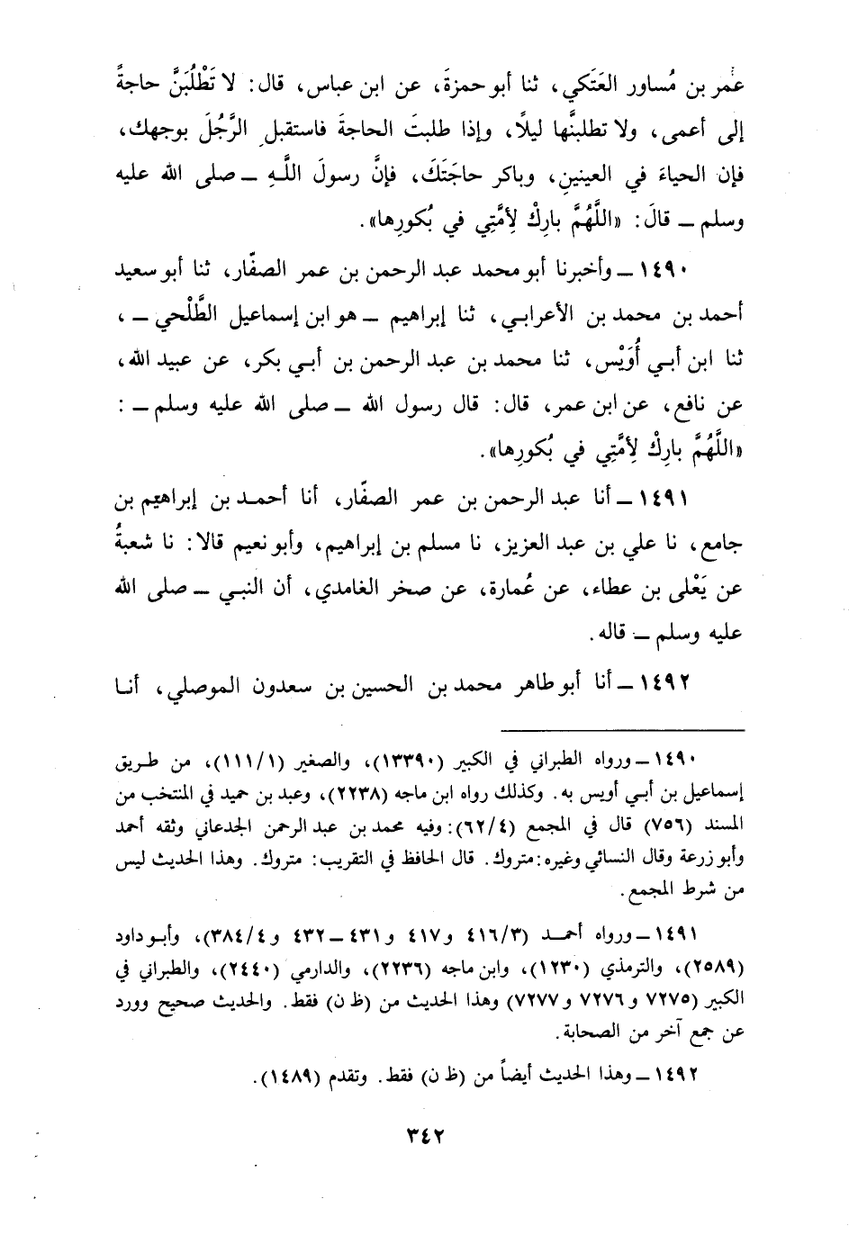 1490 - وَأَخْبَرَنَا أَبُو مُحَمَّدٍ عَبْدُ الرَّحْمَنِ بْنُ عُمَرَ الصَّفَّارُ، ثنا أَبُو سَعِيدٍ أَحْمَدُ بْنُ مُحَمَّدِ بْنِ الْأَعْرَابِيِّ، ثنا إِبْرَاهِيمُ، هُوَ ابْنُ إِسْمَاعِيلَ الطَّلْحِيُّ، ثنا ابْنُ أَبِي أُوَيْسٍ، ثنا مُحَمَّدُ بْنُ عَبْدِ الرَّحْمَنِ بْنِ أَبِي بَكْرٍ، عَنْ عُبَيْدِ اللَّهِ، عَنْ نَافِعٍ، عَنِ ابْنِ عُمَرَ، قَالَ: قَالَ رَسُولُ اللَّهِ صَلَّى اللهُ عَلَيْهِ وَسَلَّمَ: «اللَّهُمَّ §بَارِكْ لِأُمَّتِي فِي بُكُورِهَا»