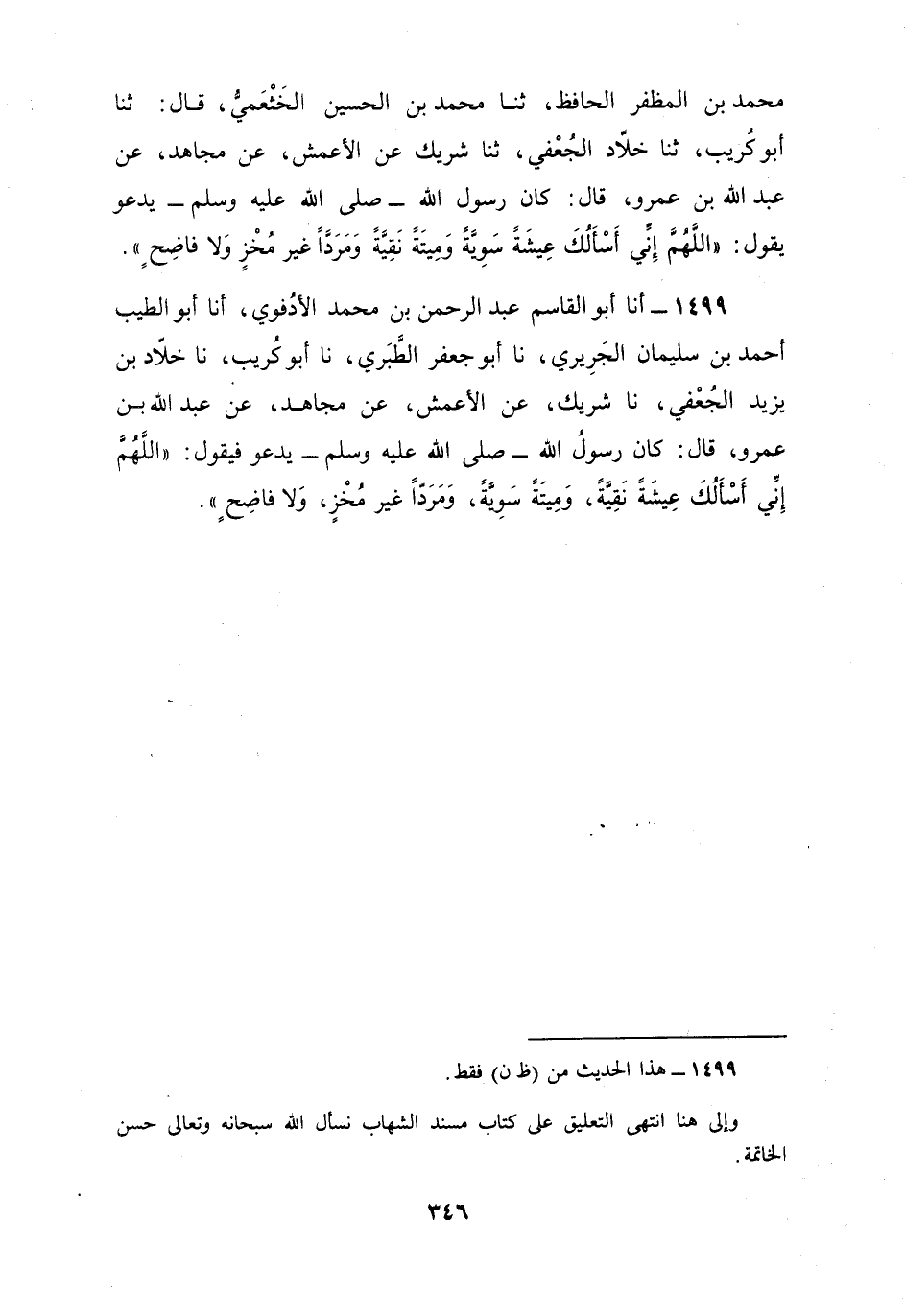 1499 - أنا أَبُو الْقَاسِمِ عَبْدُ الرَّحْمَنِ بْنُ مُحَمَّدٍ الْأُدْفُوِيُّ، أنا أَبُو الطَّيِّبِ أَحْمَدُ بْنُ سُلَيْمَانَ الْجُرَيْرِيُّ، نا أَبُو جَعْفَرٍ الطَّبَرِيُّ، نا أَبُو كُرَيْبٍ، نا خَلَّادُ بْنُ يَزِيدَ الْجُعْفِيُّ، نا شَرِيكٌ، عَنِ الْأَعْمَشِ، عَنْ مُجَاهِدٍ، عَنْ عَبْدِ اللَّهِ بْنِ عَمْرٍو، قَالَ: كَانَ رَسُولُ اللَّهِ صَلَّى اللهُ عَلَيْهِ وَسَلَّمَ يَدْعُو فَيَقُولُ: «اللَّهُمَّ إِنِّي §أَسْأَلُكَ عِيشَةً نَقِيَّةً، وَمِيتَةً سَوِيَّةً، وَمَرَدًّا غَيْرَ مُخْزٍ وَلَا فَاضِحٍ»