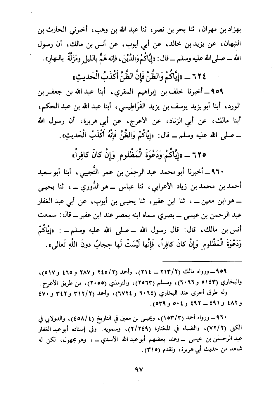 959 - أَخْبَرَنَا خَلَفُ بْنُ إِبْرَاهِيمَ الْمُقْرِئُ، أبنا عَبْدُ اللَّهِ بْنُ جَعْفَرِ بْنِ الْوَرْدِ، أبنا أَبُو يَزِيدَ، يُوسُفُ بْنُ يَزِيدَ الْقَرَاطِيسِيُّ، أبنا عَبْدُ اللَّهِ بْنُ عَبْدِ الْحَكَمِ، أبنا مَالِكٌ، عَنْ أَبِي الزِّنَادِ، عَنِ الْأَعْرَجِ، عَنْ أَبِي هُرَيْرَةَ، أَنَّ رَسُولَ اللَّهِ صَلَّى اللهُ عَلَيْهِ وَسَلَّمَ قَالَ: «§إِيَّاكُمْ وَالظَّنَّ، فَإِنَّهُ أَكْذَبُ الْحَدِيثِ»